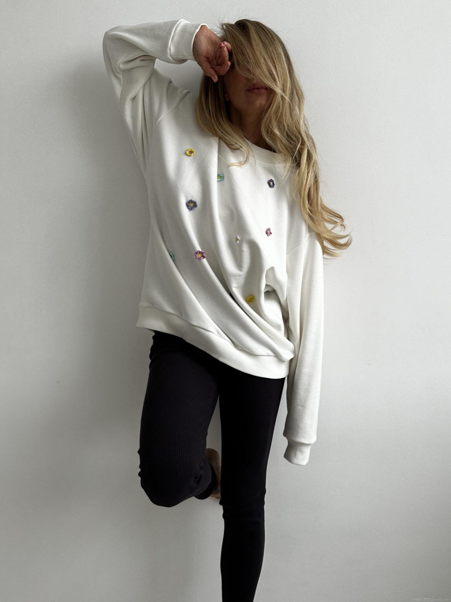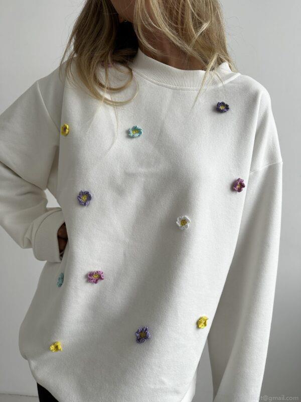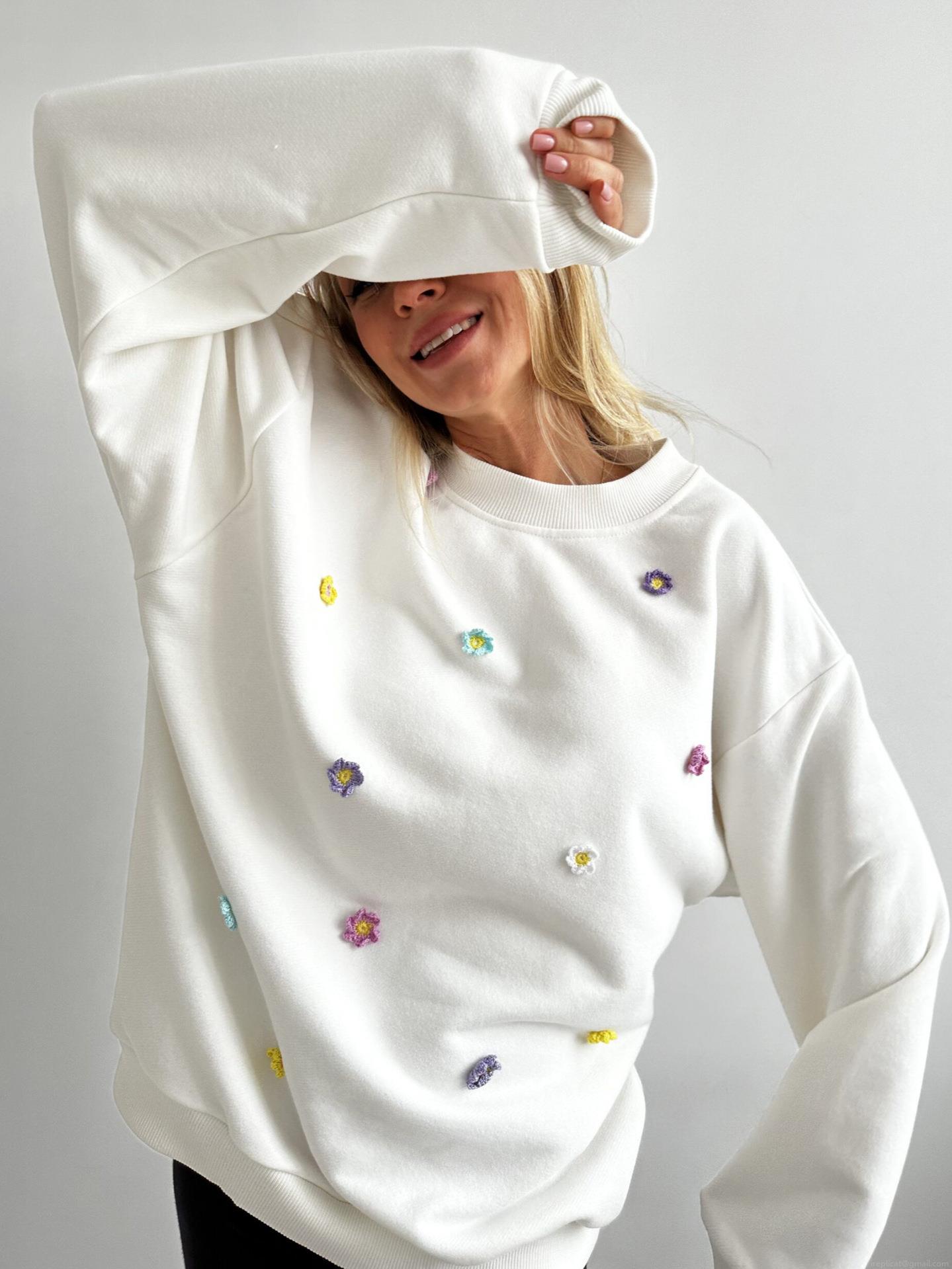 Women's Cotton Sweatshirt 3D Handmade Crochet Flower Decoration Loose Fit Round Neck Long Sleeve Pullover Top Casual Streetwear