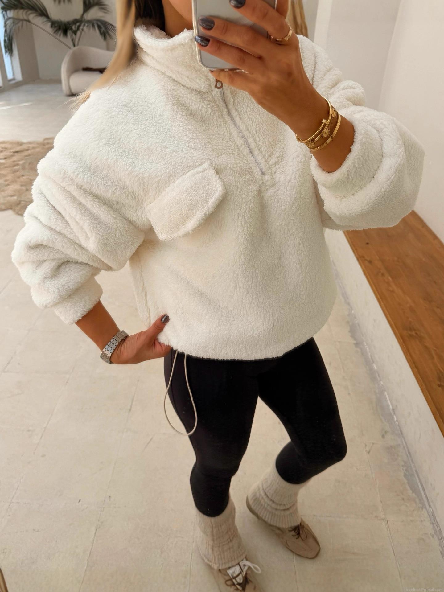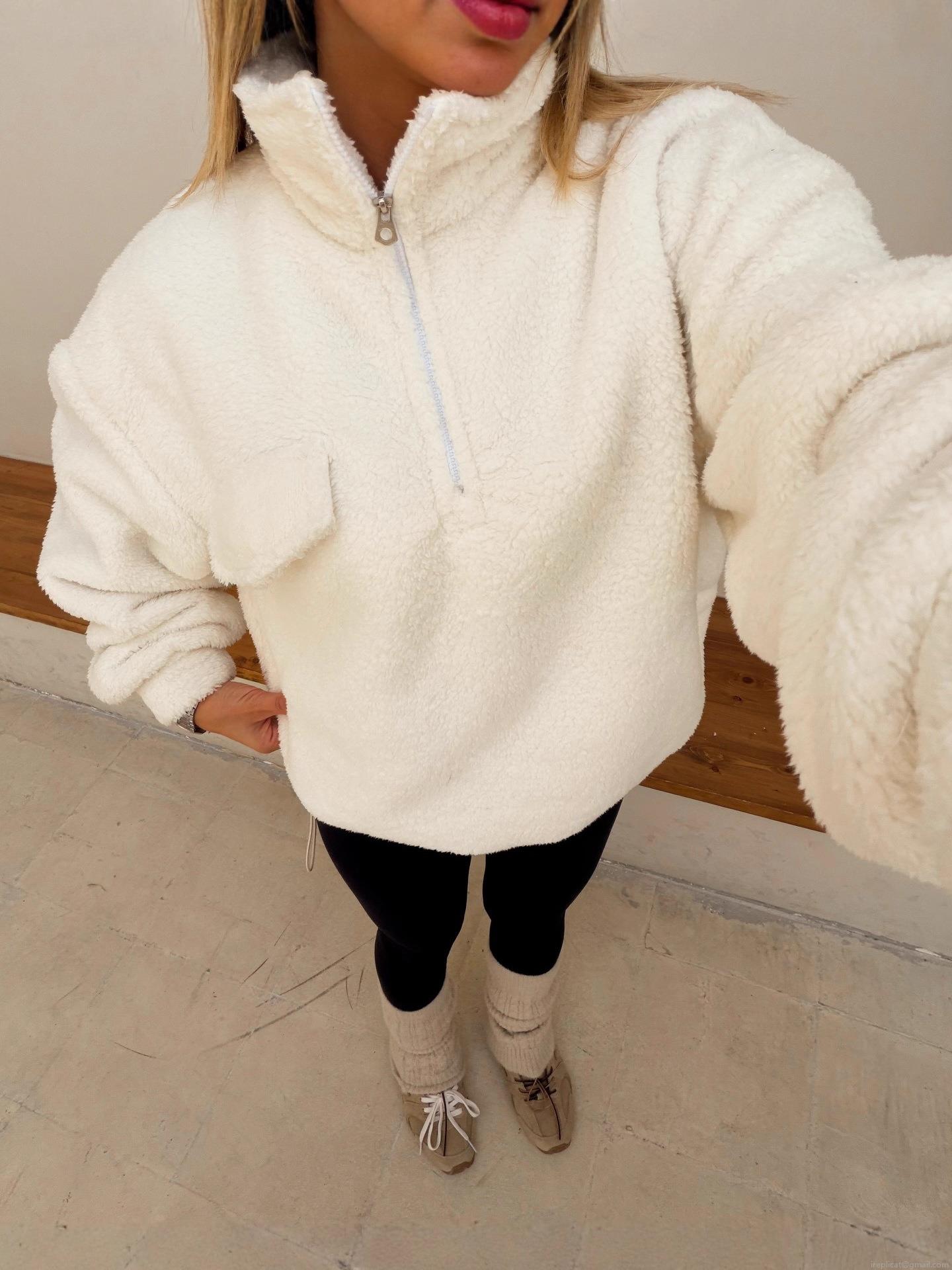 • Women's Half Zip Fleece Sweatshirt Loose 100 Cotton Warm Stand Collar Pullover Jacket With Chest Pocket Casual Winter Solid Color Outerwear