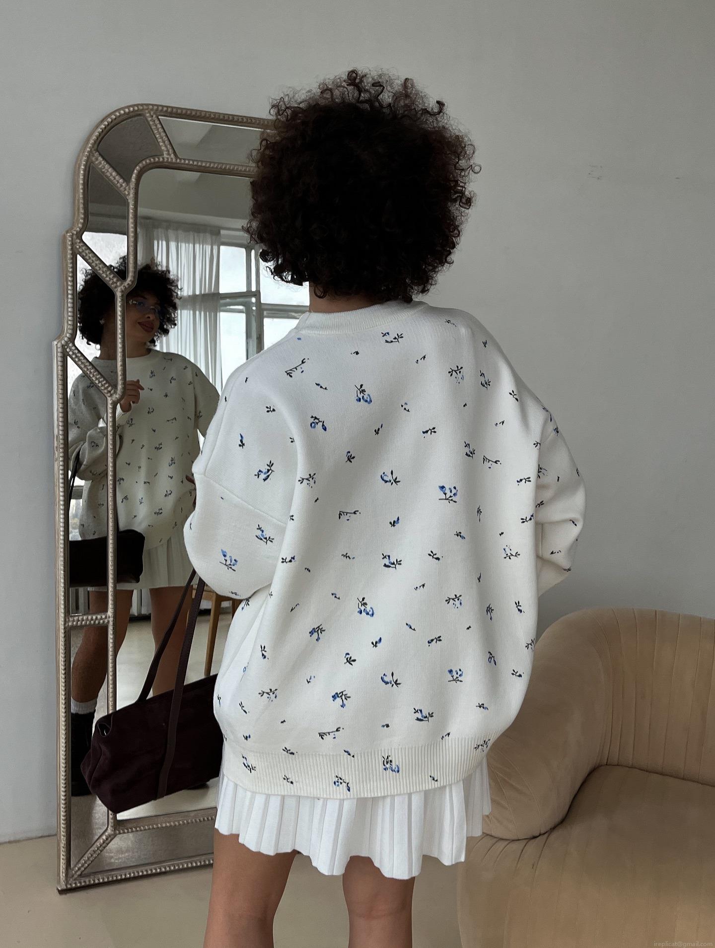 Blue Floral Pattern, Flowers, Floral Print, Crew Neck, Loose Fit, Dropped Shoulder Sleeves