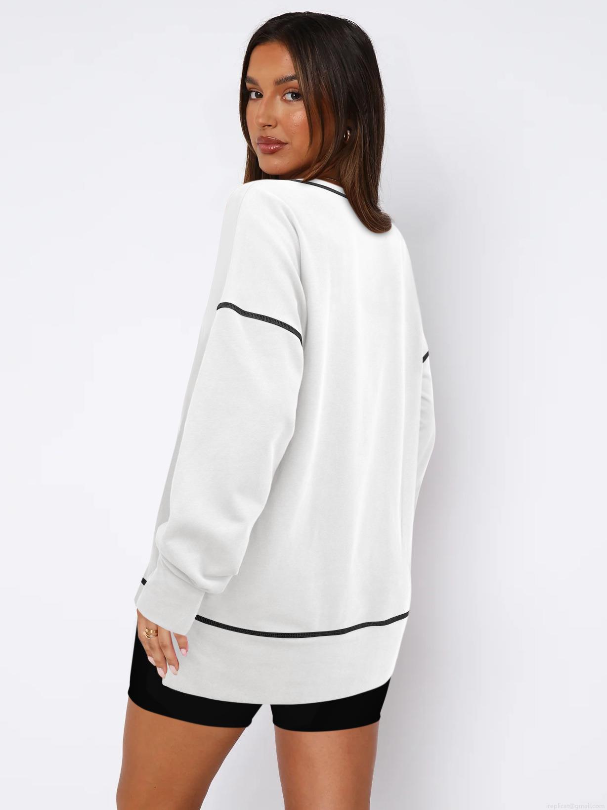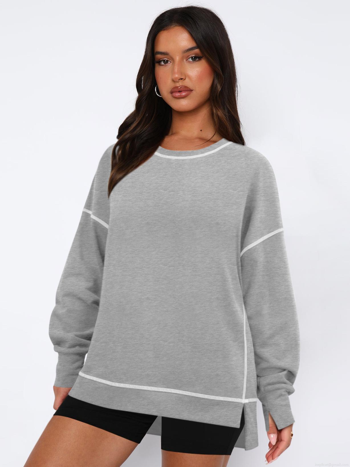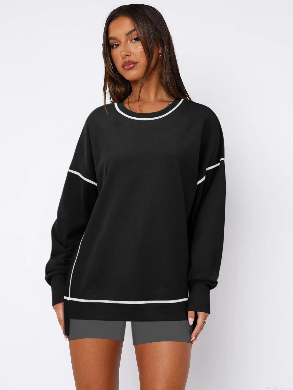 • Women's Loose Viscose Sweatshirt Contrast Stitching Round Neck Long Sleeve Side Split Pullover Casual Contrast Color Top For Women