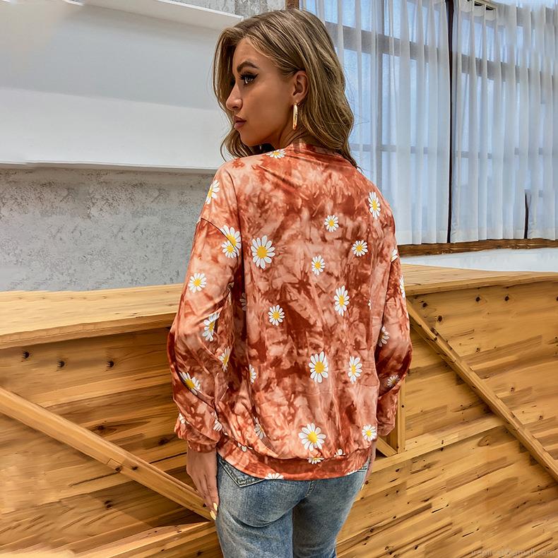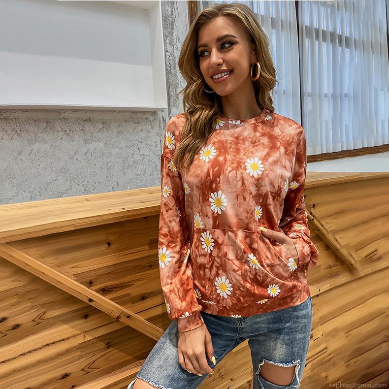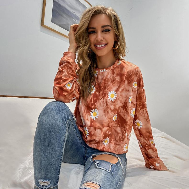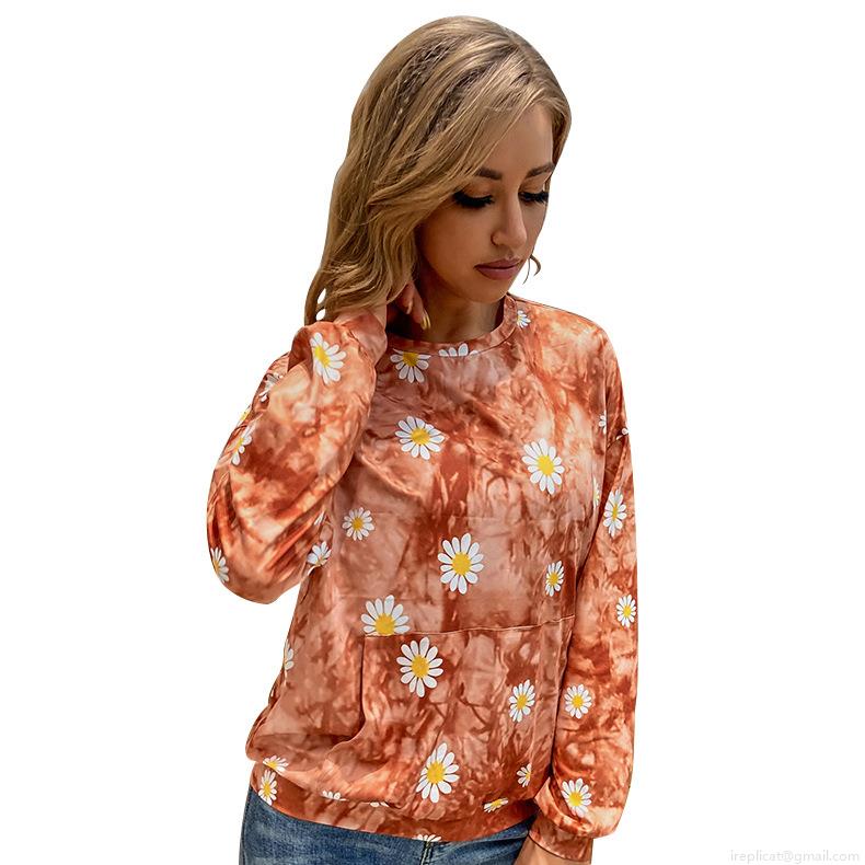 • Women's Orange Tie-Dye Daisy Print Sweatshirt Casual Long Sleeve Round Neck Loose Pullover Top With Kangaroo Pocket For Autumn Daily Streetwear