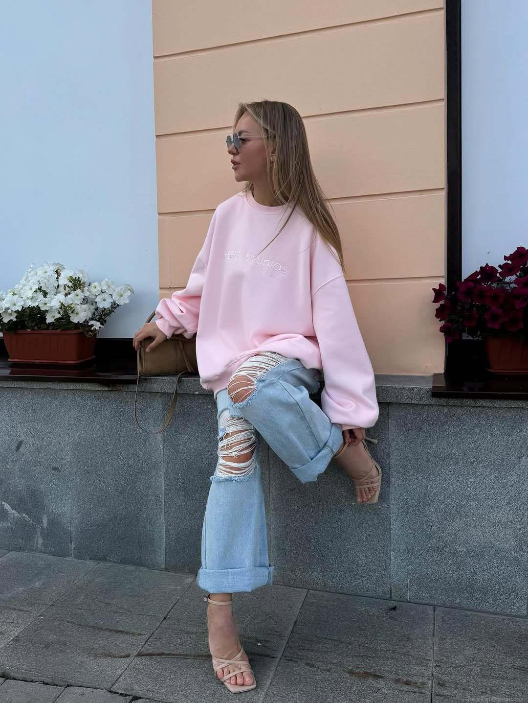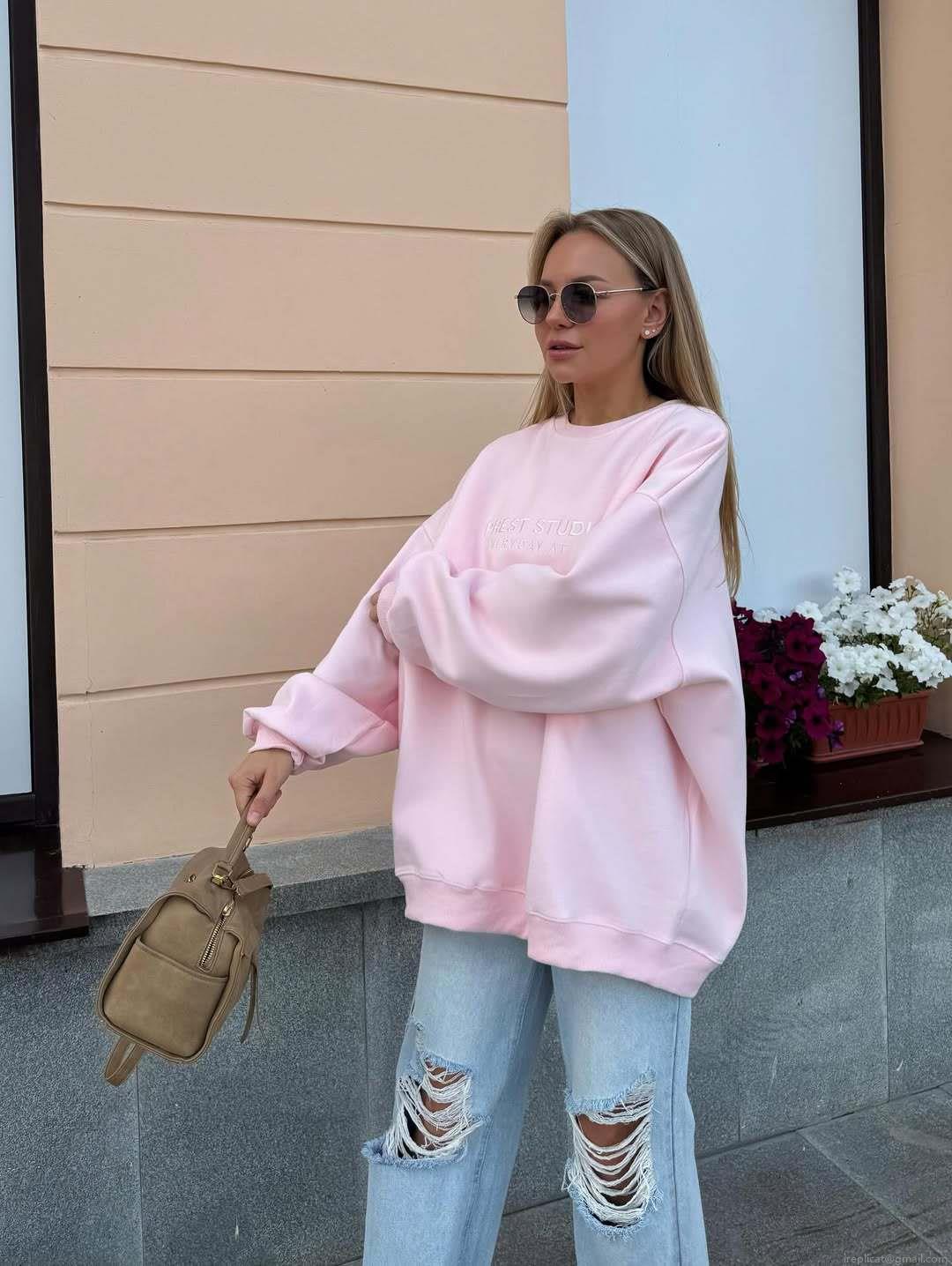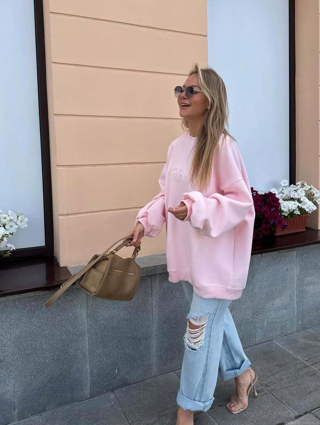 • Women's Oversized Cotton Sweatshirt Casual Letter Embroidery Crew Neck Long Sleeve Pullover Autumn Streetwear Loose Fashion Pink Top