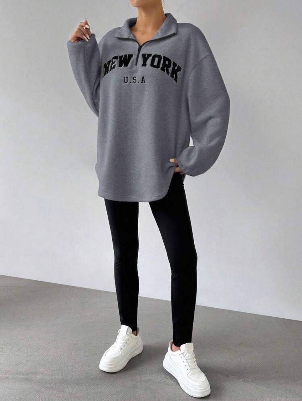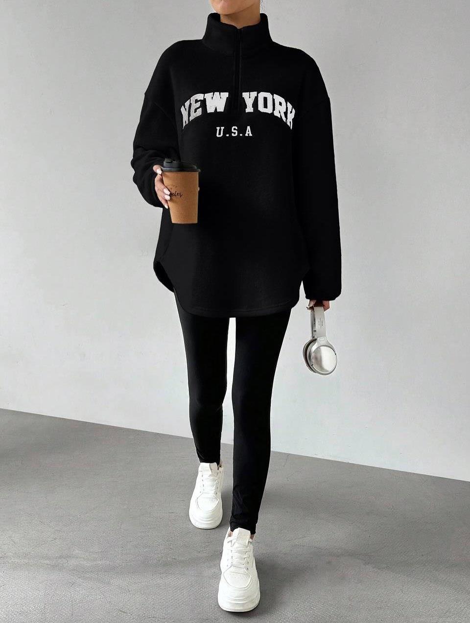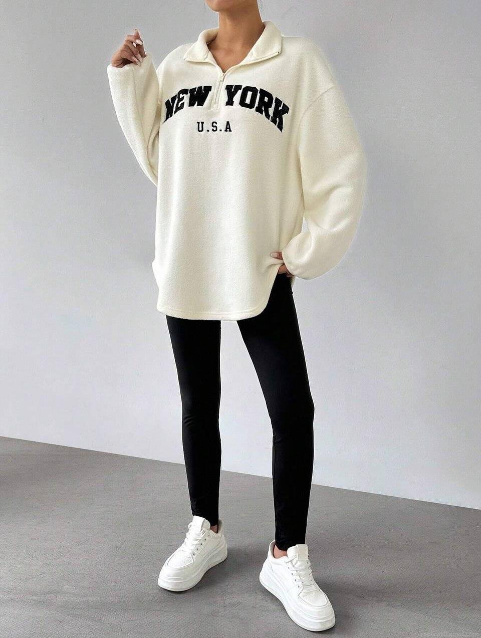 Embroidery, Half Zipper, Stand-up Collar, Oversize, New York U.s.a., Dropped Shoulders
