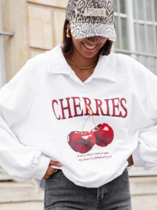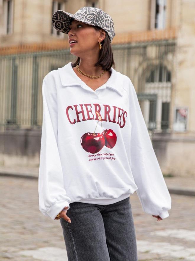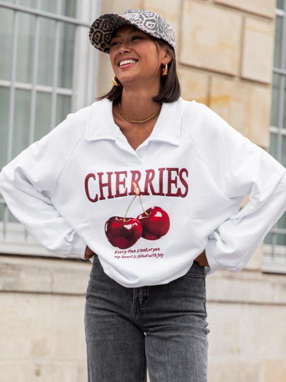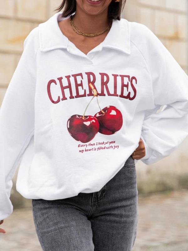 • Women's Oversized Sweatshirt Cotton Polyester Blend Red Cherry Print Lapel Polo Neck Long Sleeve Pullover Casual Streetwear Fall Winter Top