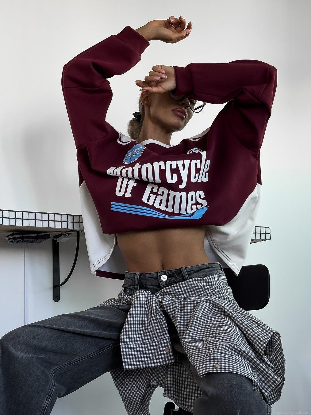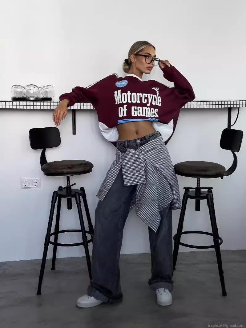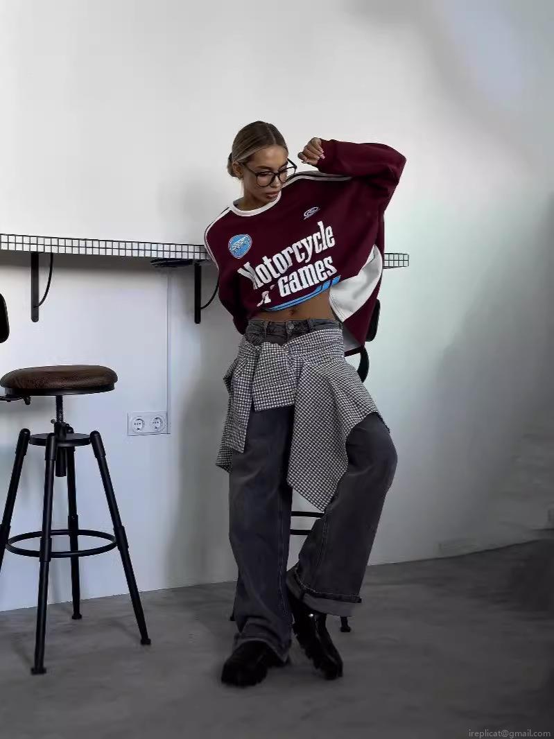 Women's Vintage Letter Print Round Neck Sweatshirt Cotton Blend Long Sleeve Pullover Loose Fit Streetwear Autumn Casual Wine Red Top