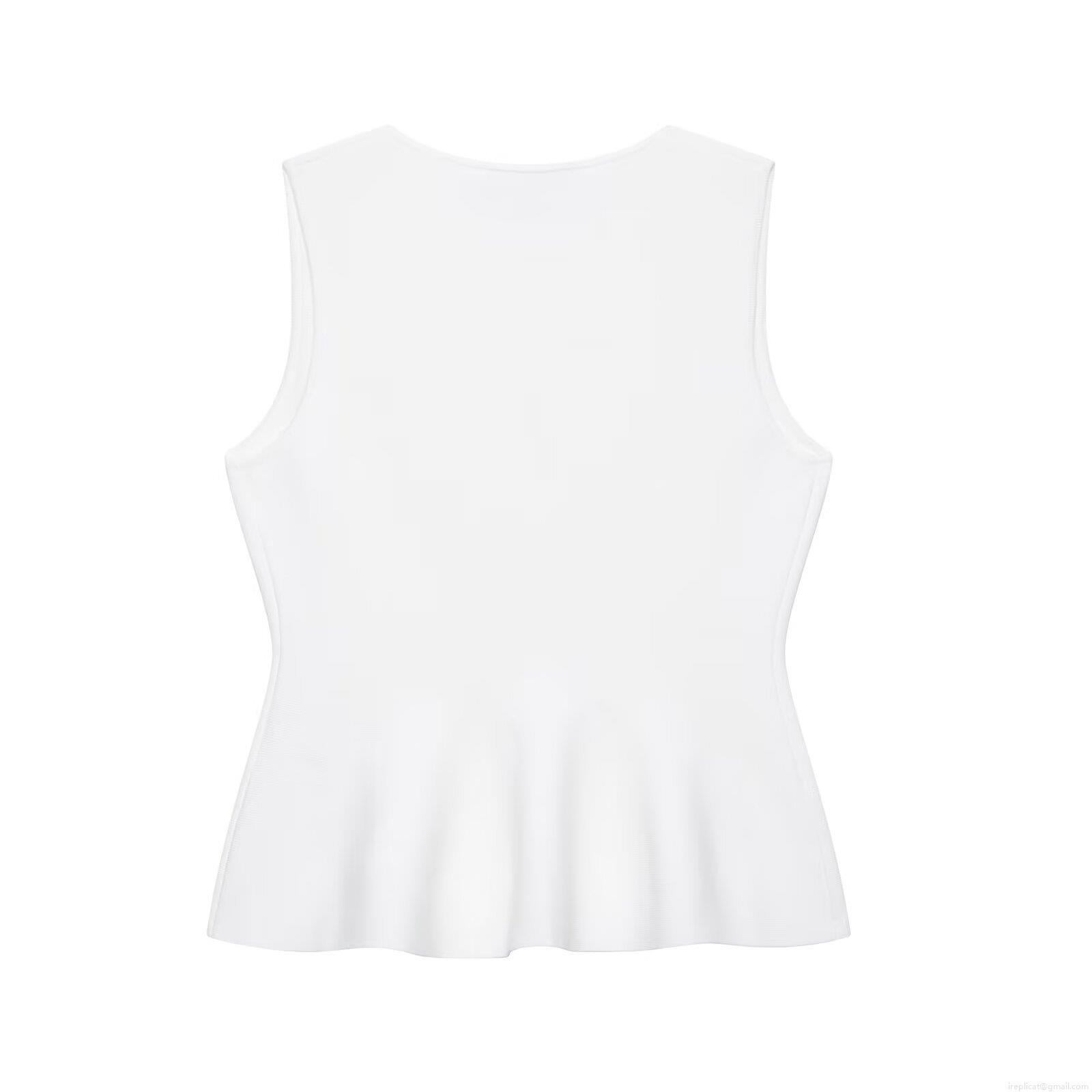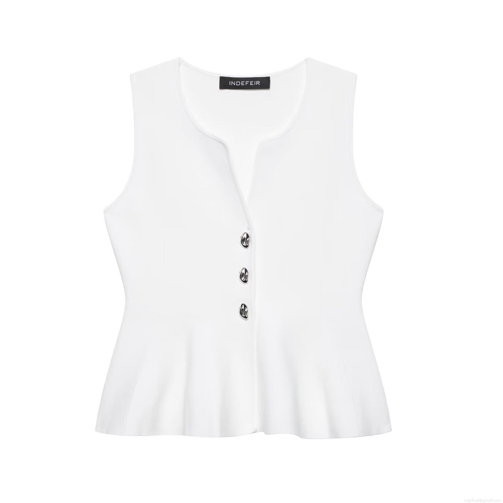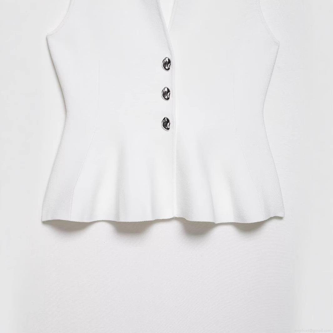 Elegant White Peplum Knit Tank Top Sleeveless V Neck With Silver Metal Buttons Slim Fit Waist Ruffle Blouse For Women Party Casual Chic Commuting