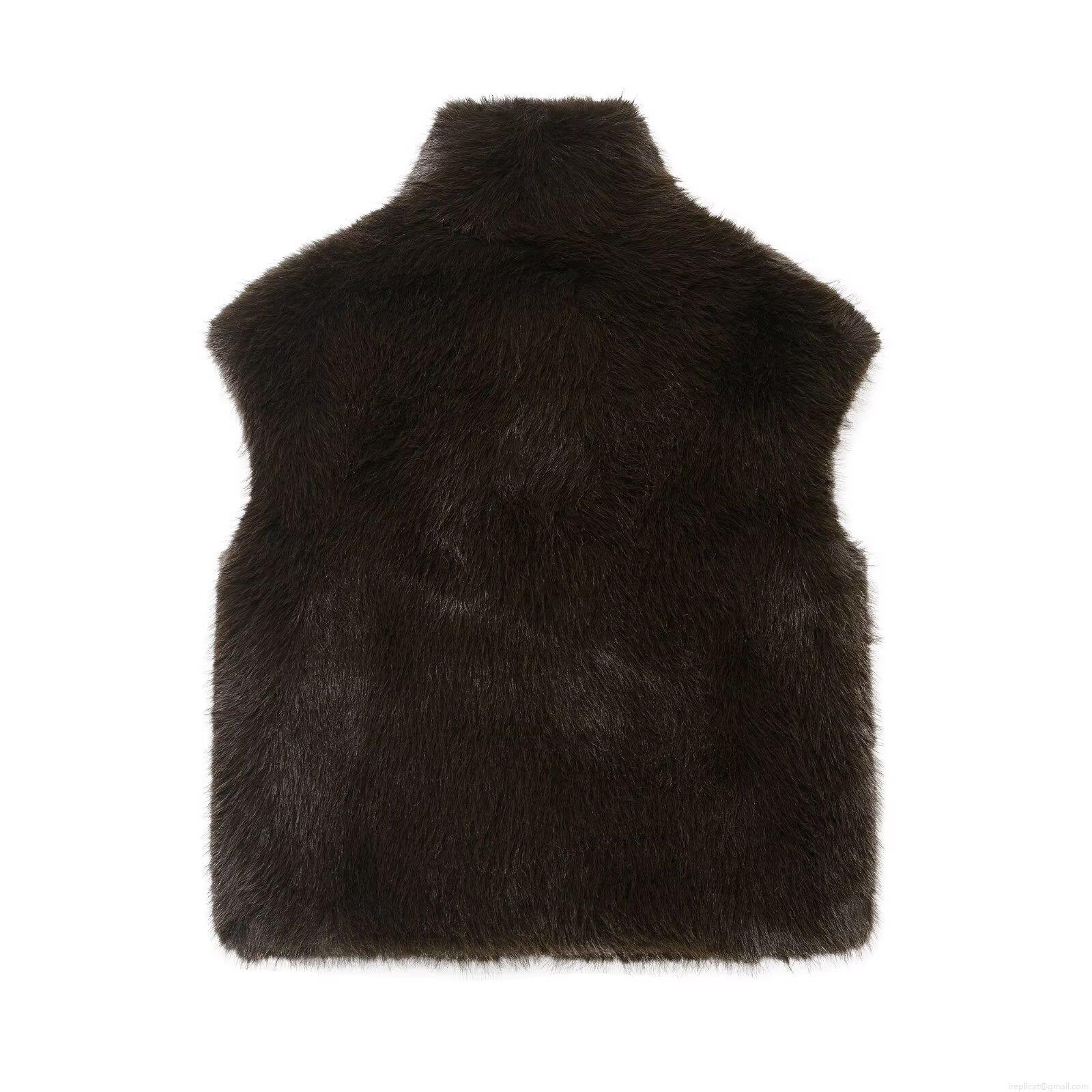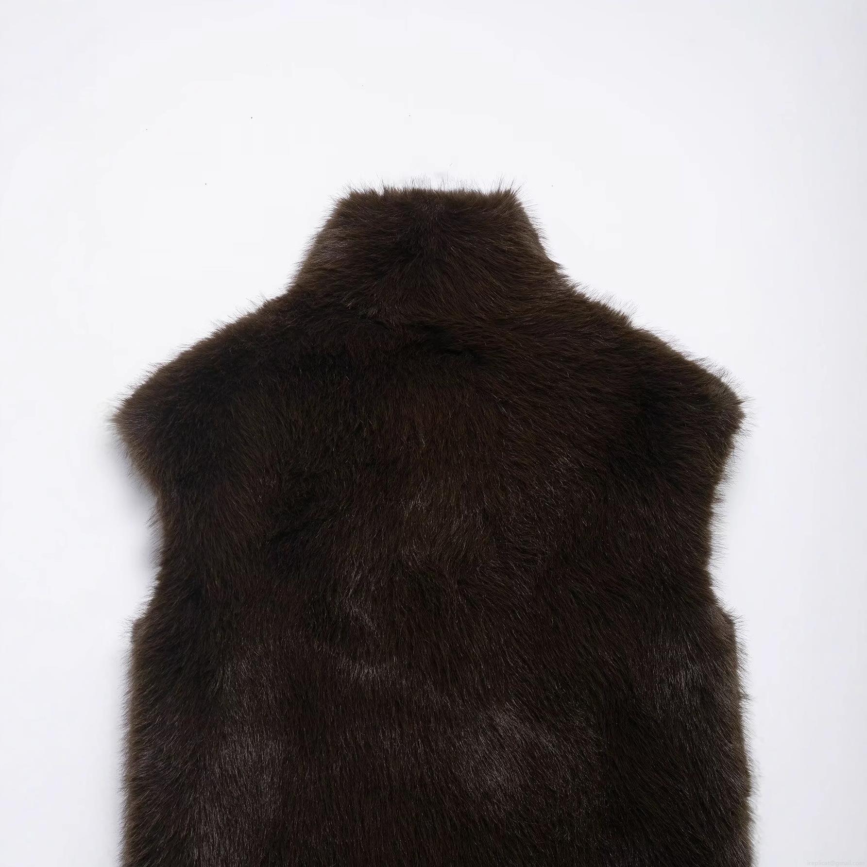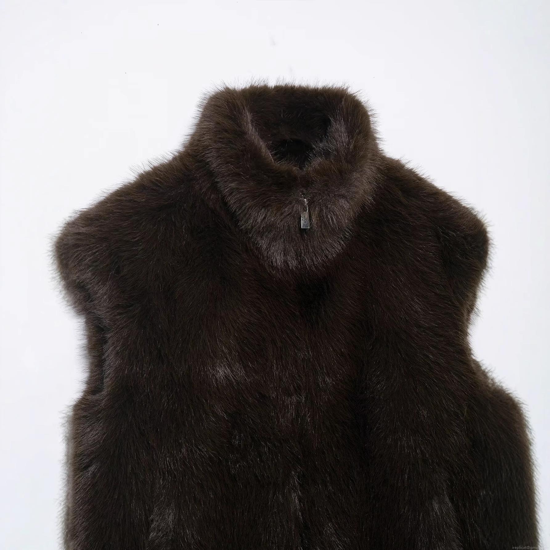 • Fashion Women's Faux Fur Vest Sleeveless Stand Collar Metal Zipper Solid Deep Brown Warm Waistcoat For Autumn Winter Outdoor Casual Streetwear