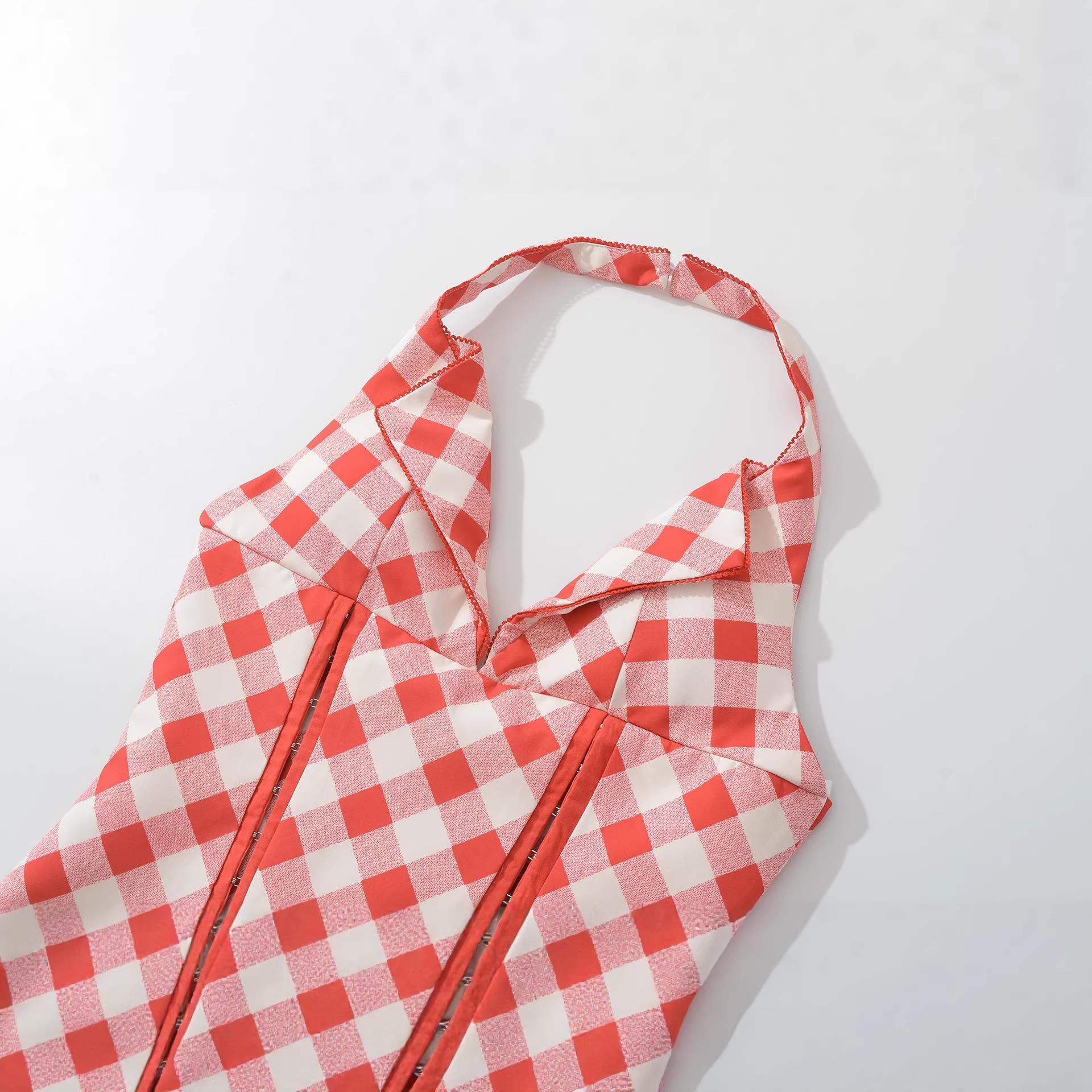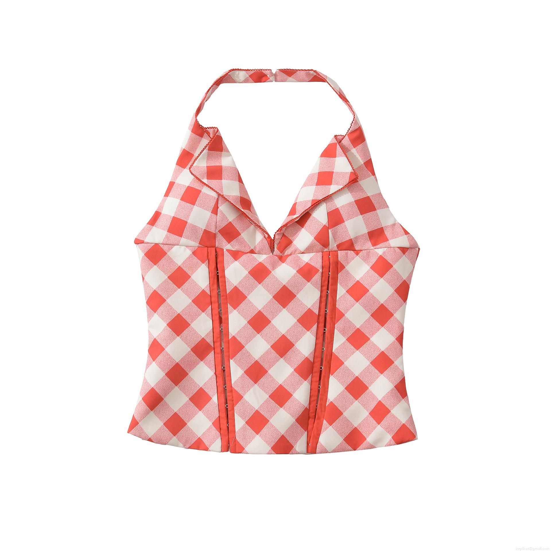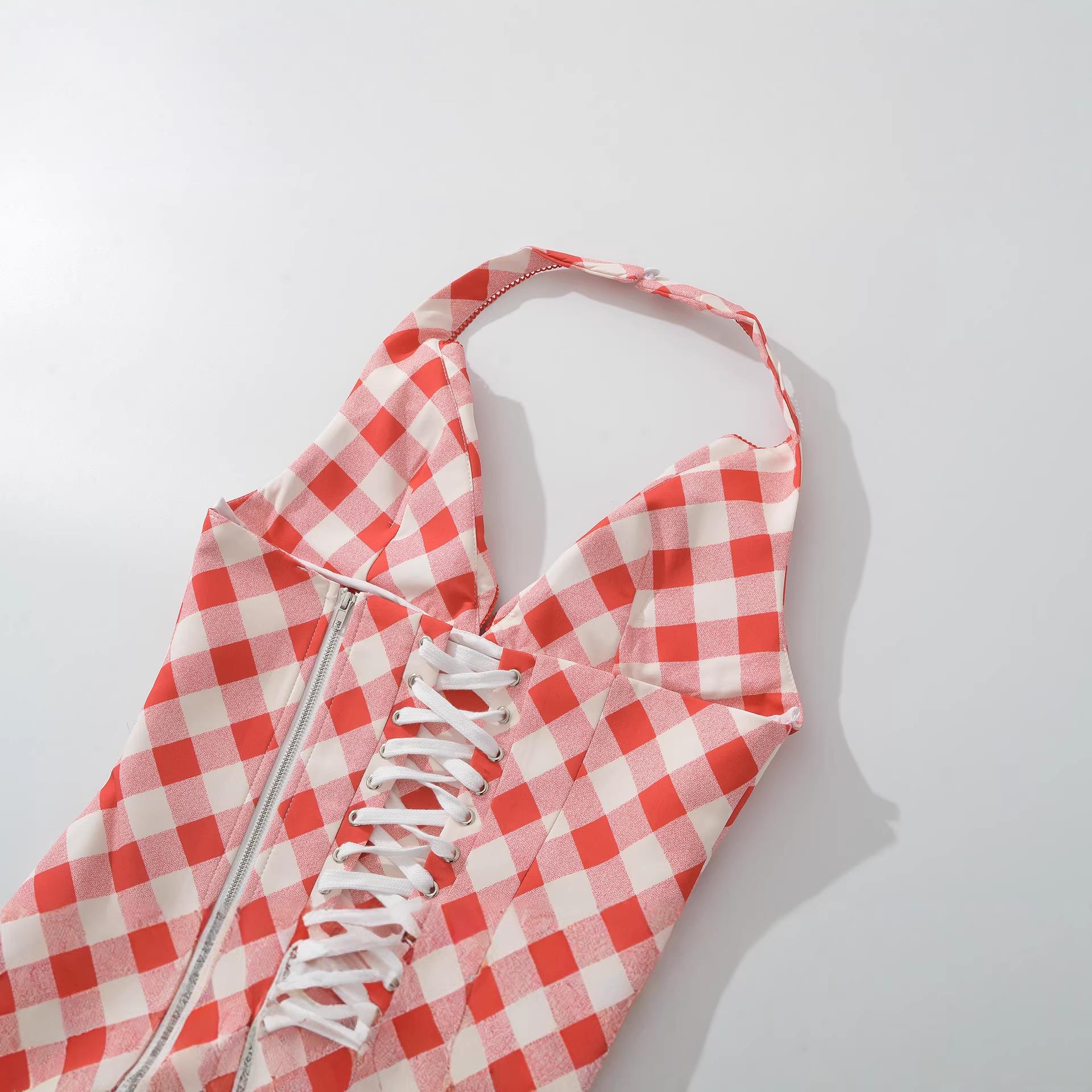 • Fashionable Women Halter Top Retro Red White Gingham Lace-up V-neck Backless Corset Bustier Crop Top Summer Vacation Streetwear Polyester Plaid Tank Top With Metal Zipper