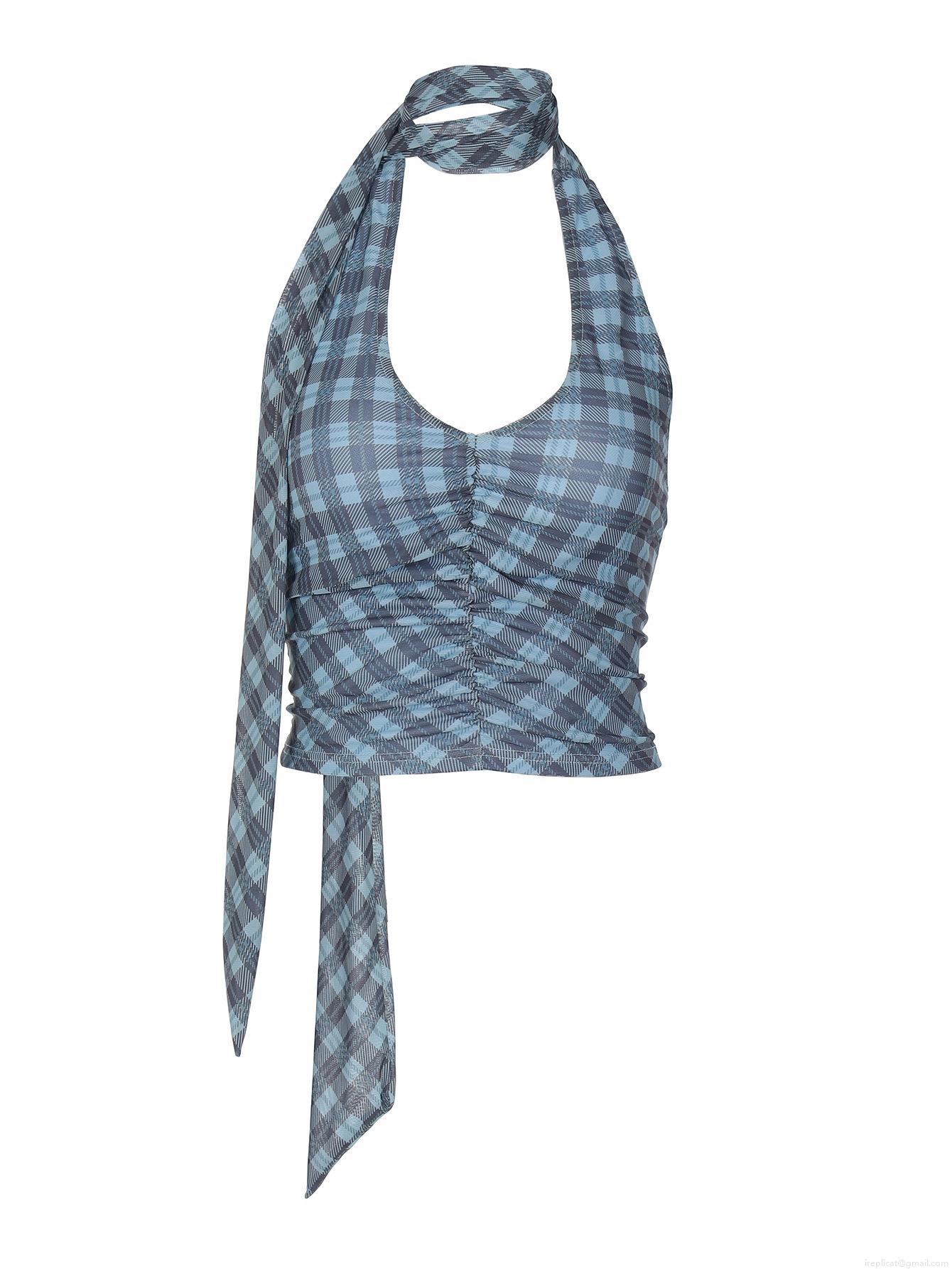• French Vintage Plaid Halter Tank Top Sexy Backless Ruched Camisole For Women Polyester Spandex Streetwear Slim Fit Crop Top With Matching Neck Band