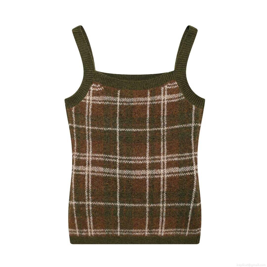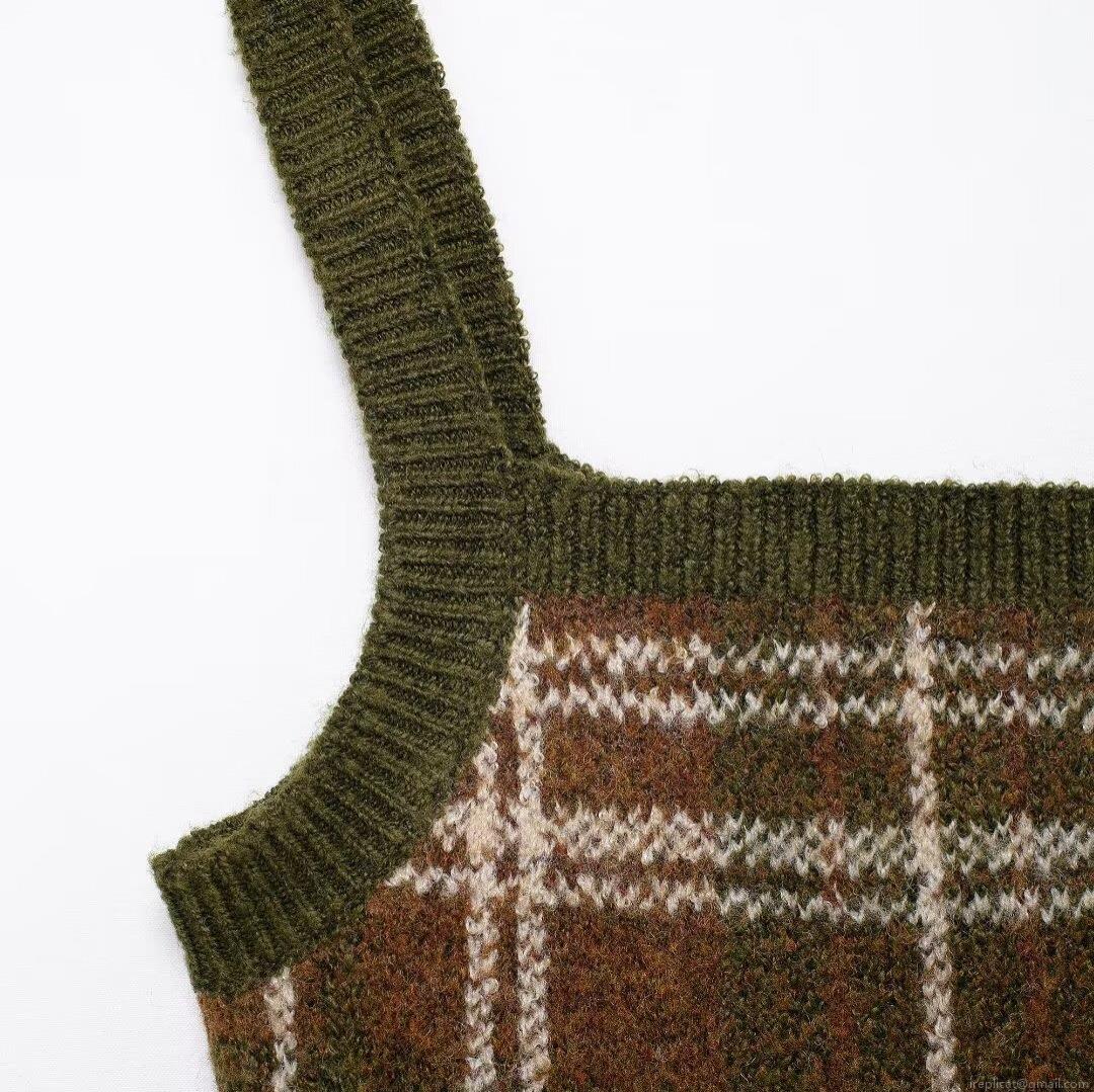 • Retro British Style Plaid Knit Camisole Women Slim Fit Sleeveless Crop Top With Decorative Pockets Army Green Comfortable Pullover Top