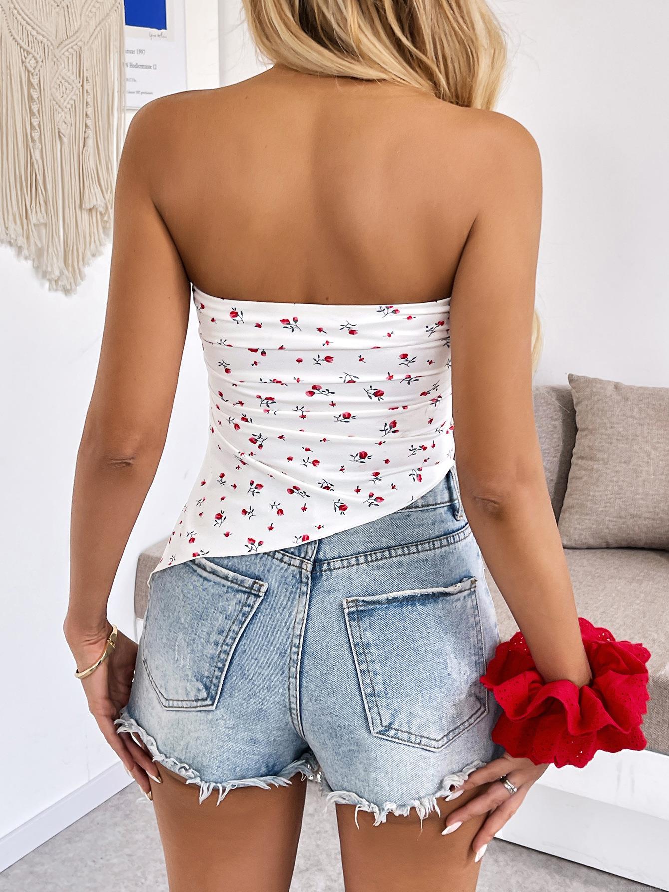 • Sexy Floral Tube Top Polyester Spandex Ruched Side Drawstring Irregular Hem Vest For Summer Beach Vacation Party Women Slim Fit Sleeveless Crop Top