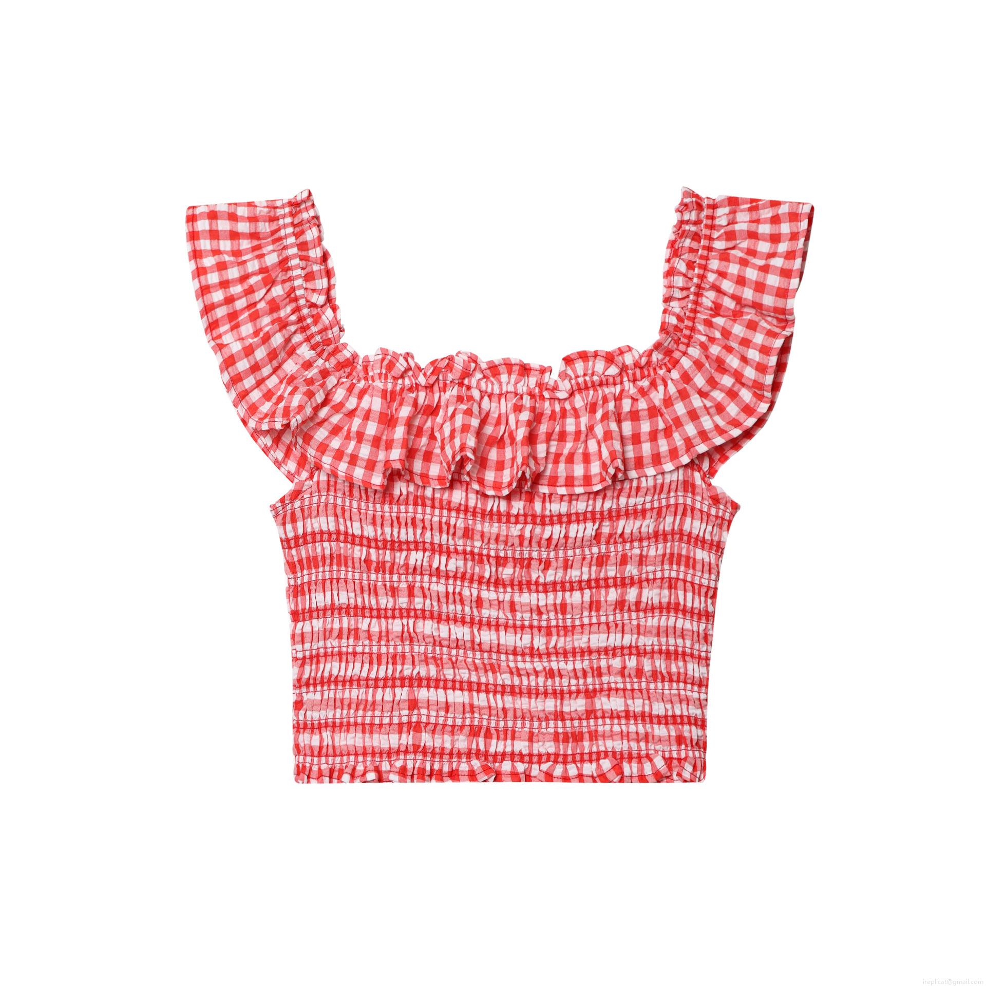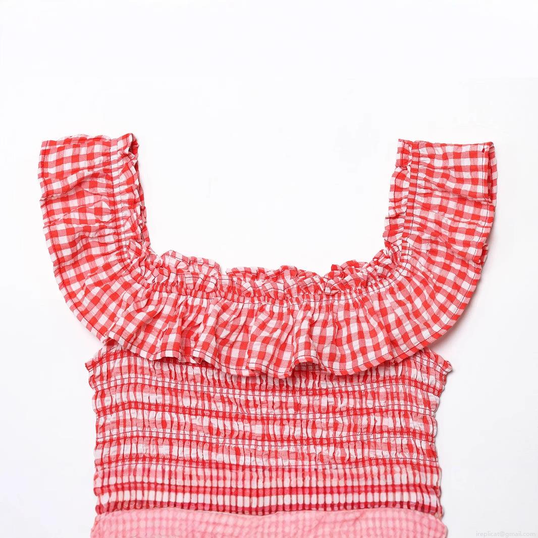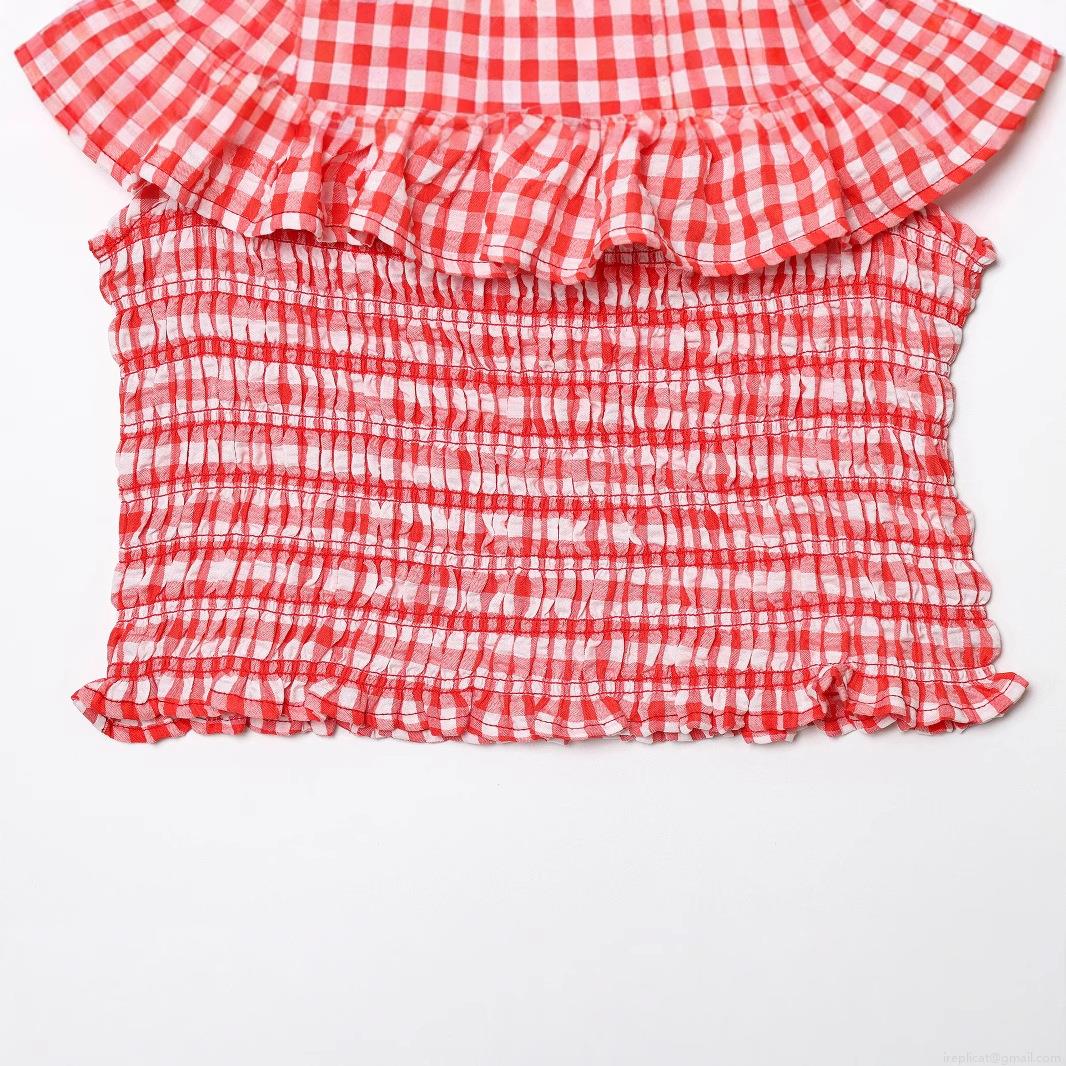 • Sexy Gingham Smocked Crop Top Women Ruffle Straps Square Neck Polyester Sleeveless Tank Top Sweet French Style Summer Cami For Vacation