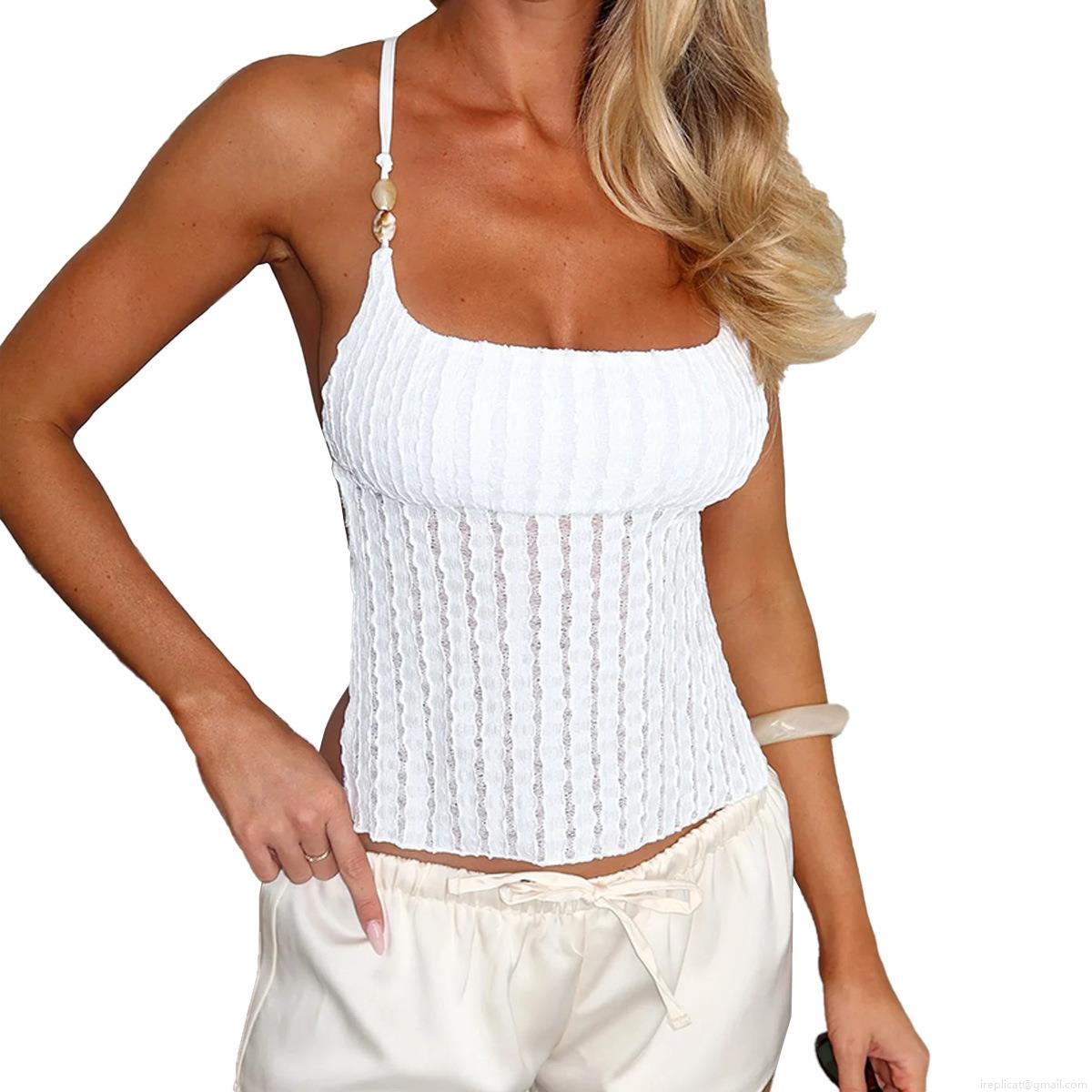 • Sexy Halter Neck Backless Cropped Camisole Top With Pearl Beaded Straps Vertical Pleated Knitted Fabric Summer Beach Vacation Slim Fit Tank Top For Women