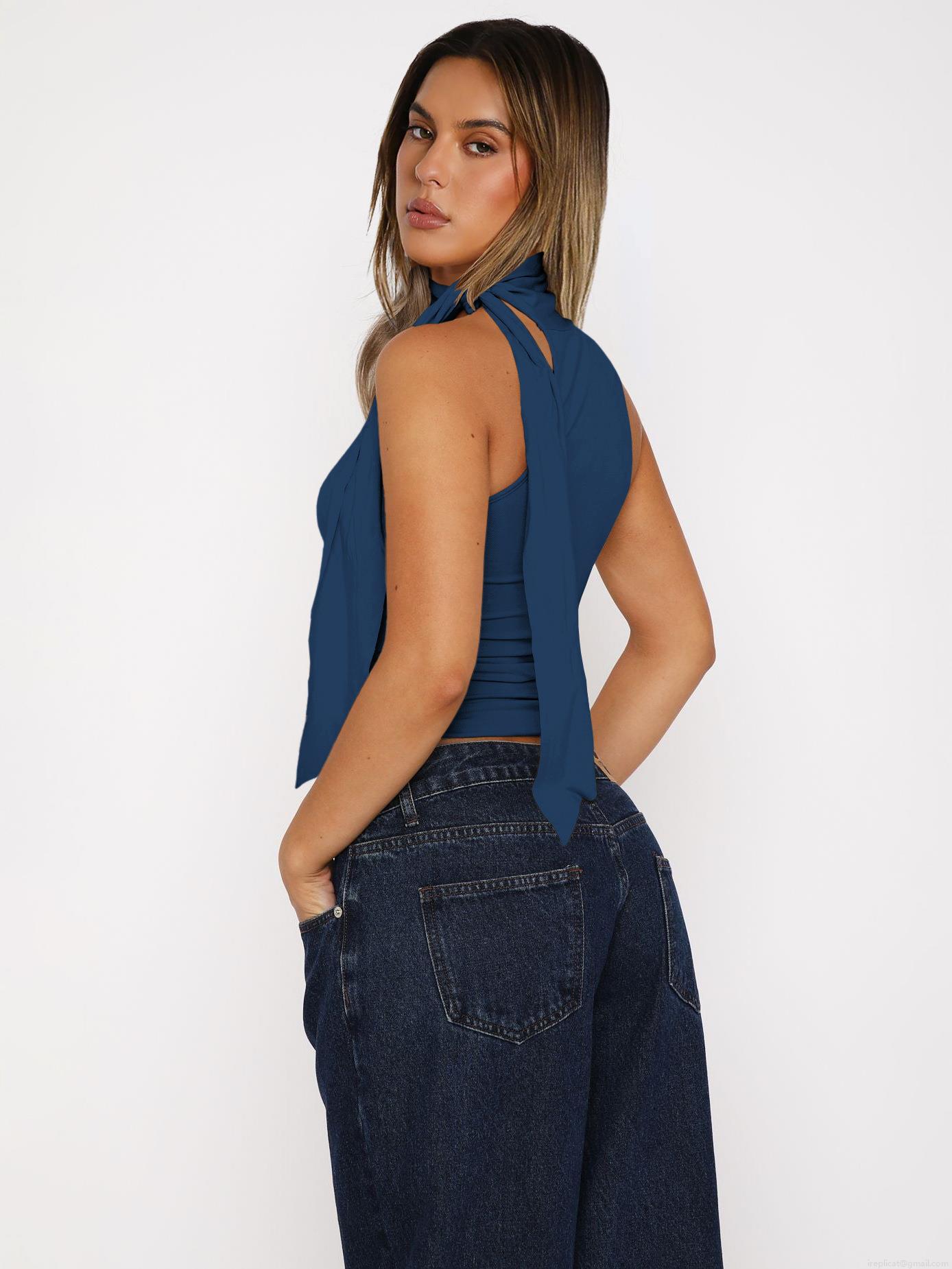 Sexy Halter Neck Ribbed Knit Tank Top Women Elegant Backless Streetwear Slim Fit Sleeveless Vest With Side Streamer Y2K Clubwear Top