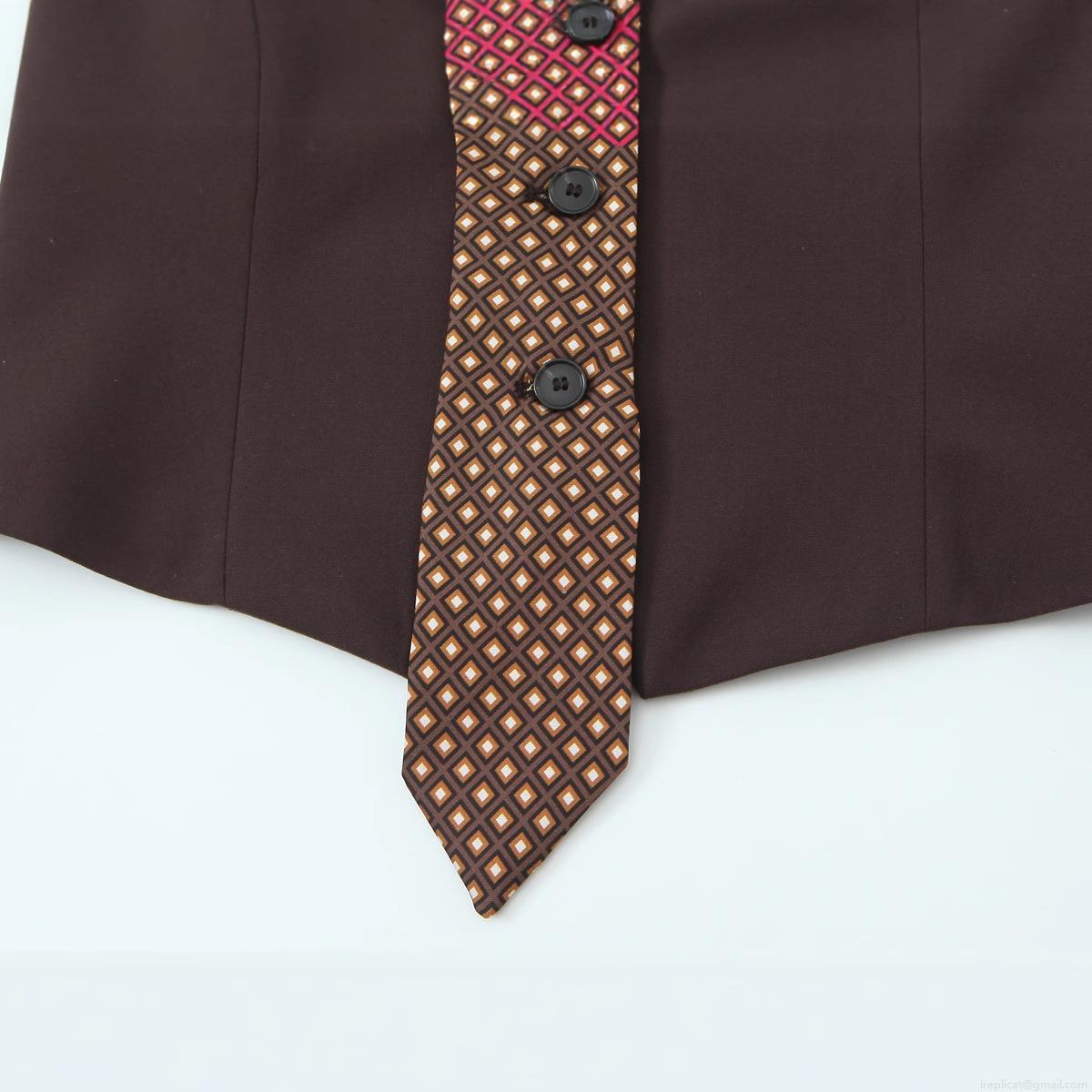 Geometric Rhombus, Checkered Pattern, Color Blocking, Buttons, Neckband, V-neck, Tie Decoration