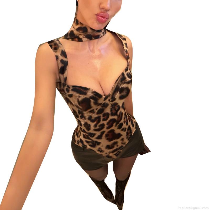 • Sexy Leopard Print Corset Top Women Sleeveless Square Neck Slim Fit Satin Polyester Tank Top With Matching Choker Streetwear Clubwear Party Top