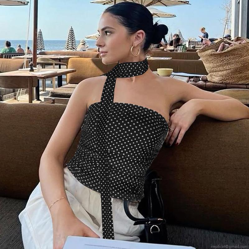 • Sexy Polka Dot Ruched Tube Top Halter Neck Crop Top With Matching Neck Scarf Sleeveless Slim Fit Polyester Spandex Backless Party Clubwear Vest For Women