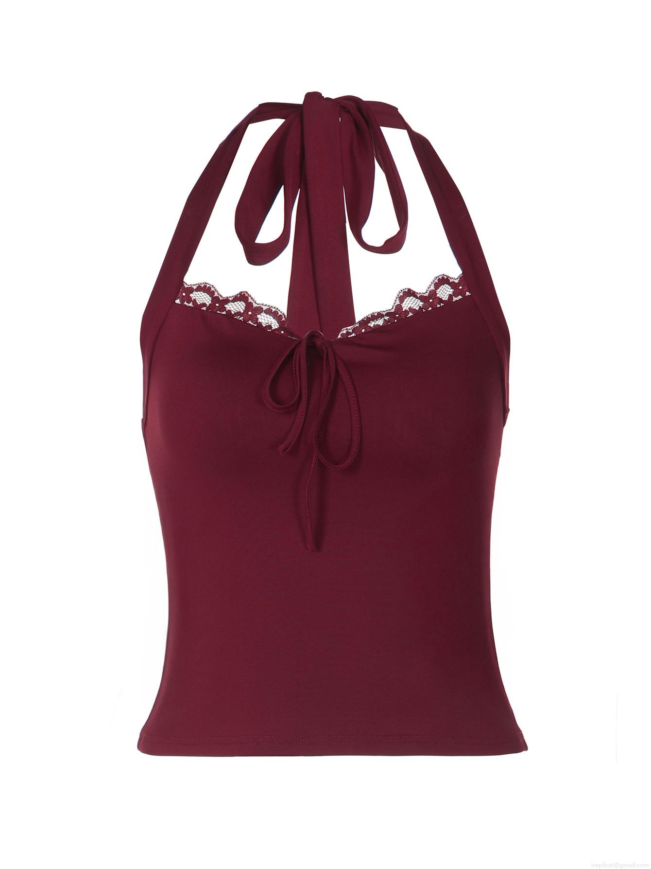 • Sexy Polyester Spandex Halter Top With Lace Trim Backless Tie Front Bow Camisole Ribbed Knit Sleeveless Crop Top For Party Clubwear Summer Women