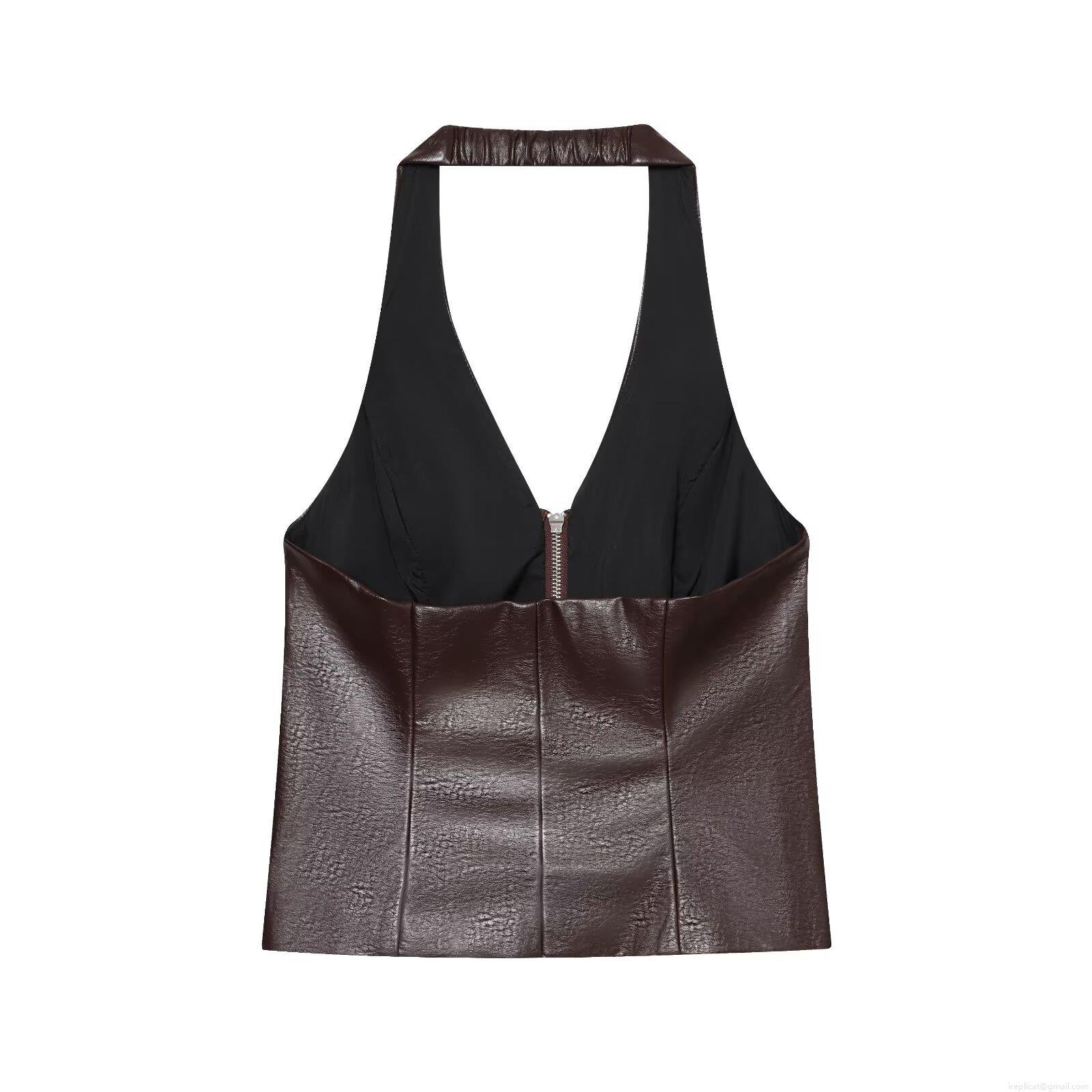 Sexy PU Leather Halter Neck Tank Top With Front Zipper Closure Summer Streetwear Sleeveless Backless Slim Fit Cami Top For Women