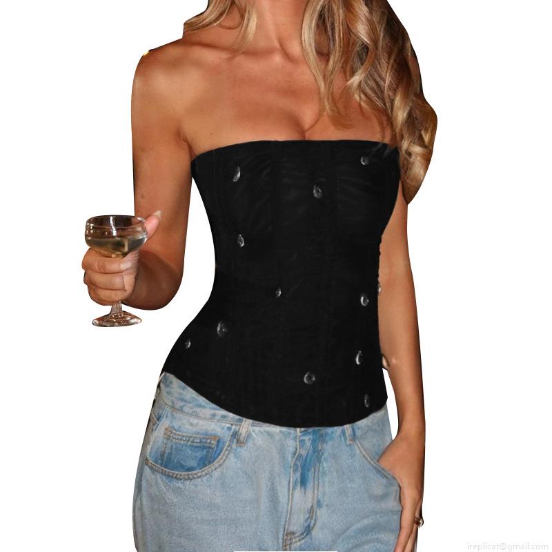 • Sexy Rhinestone Corset Top Strapless Fishbone Bustier Crop Top For Women Party Night Club Y2K Streetwear Sleeveless Polyester Spandex Mesh Tank Top