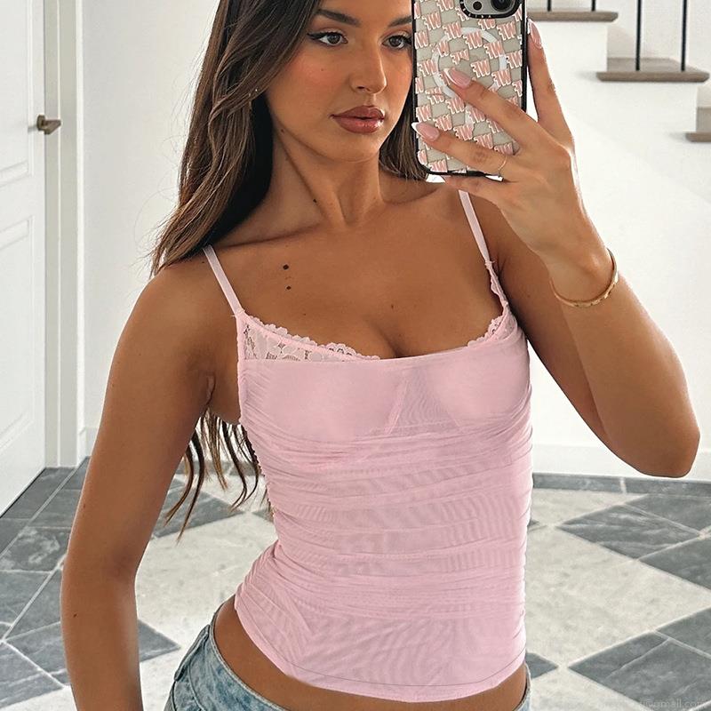 • Sexy Ruched Mesh Camisole Top With Lace Trim Women Slim Fit Polyester Mesh Pleated Spaghetti Strap Vest For Party Club Y2K Fashion