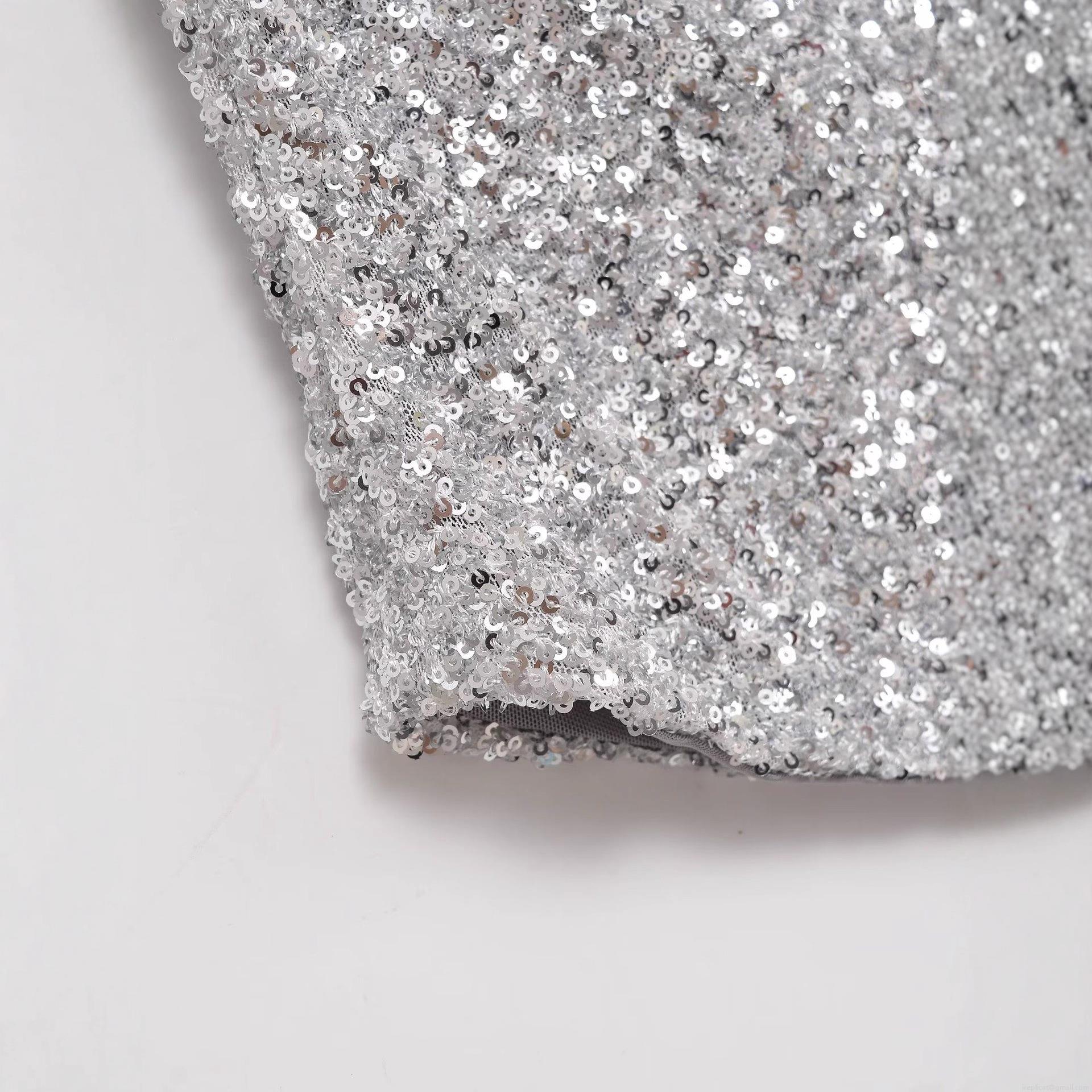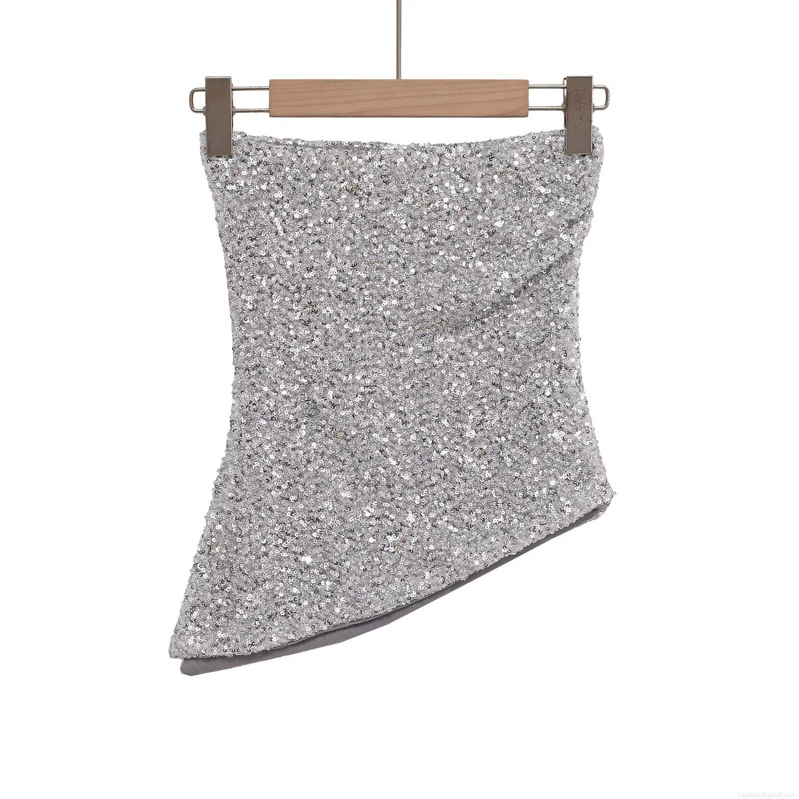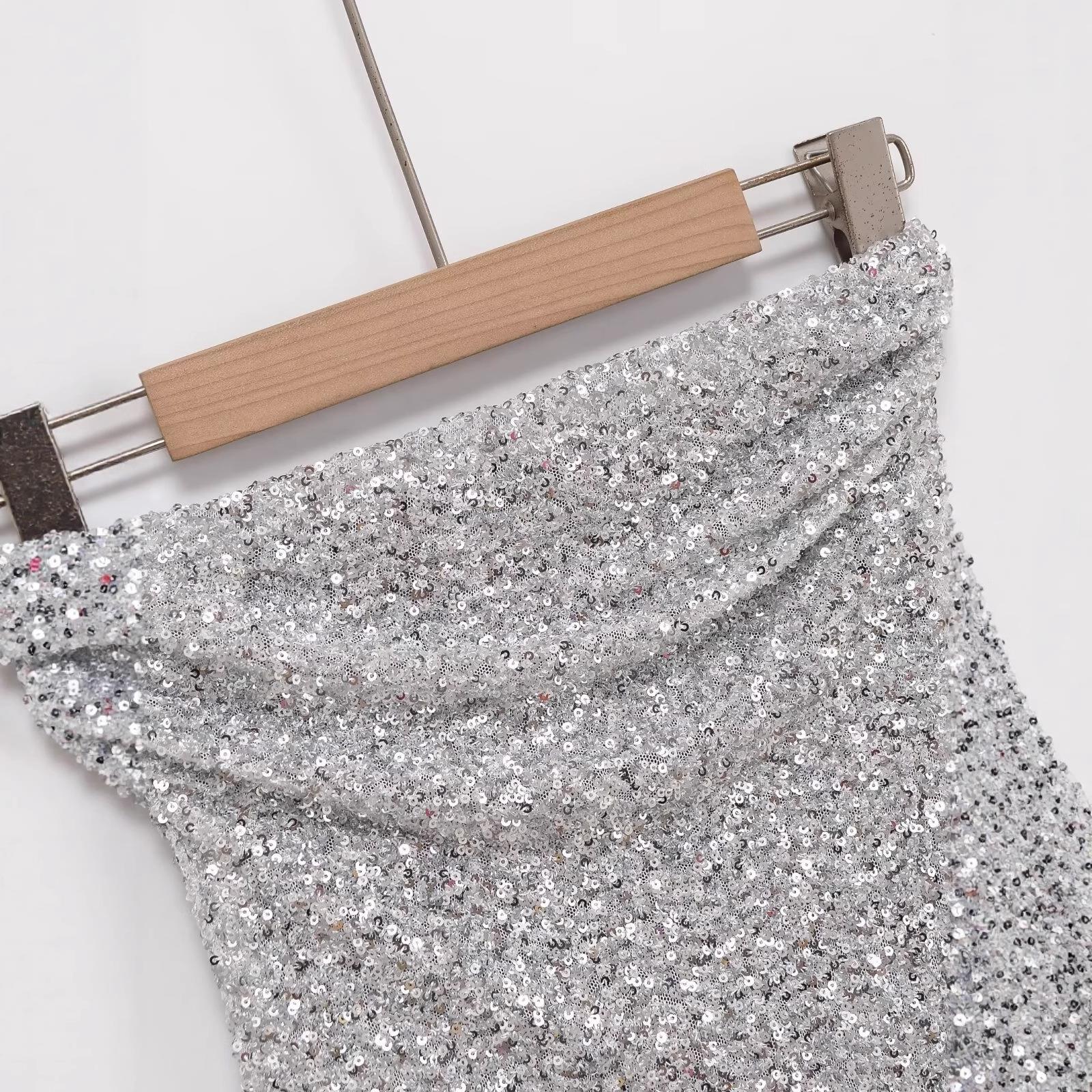 • Sexy Silver Sequin Tube Top Strapless Asymmetric Hem Slim Fit Party Clubwear Sparkly Women's Bandeau Top Polyester Sleeveless Blouse For Evening Prom