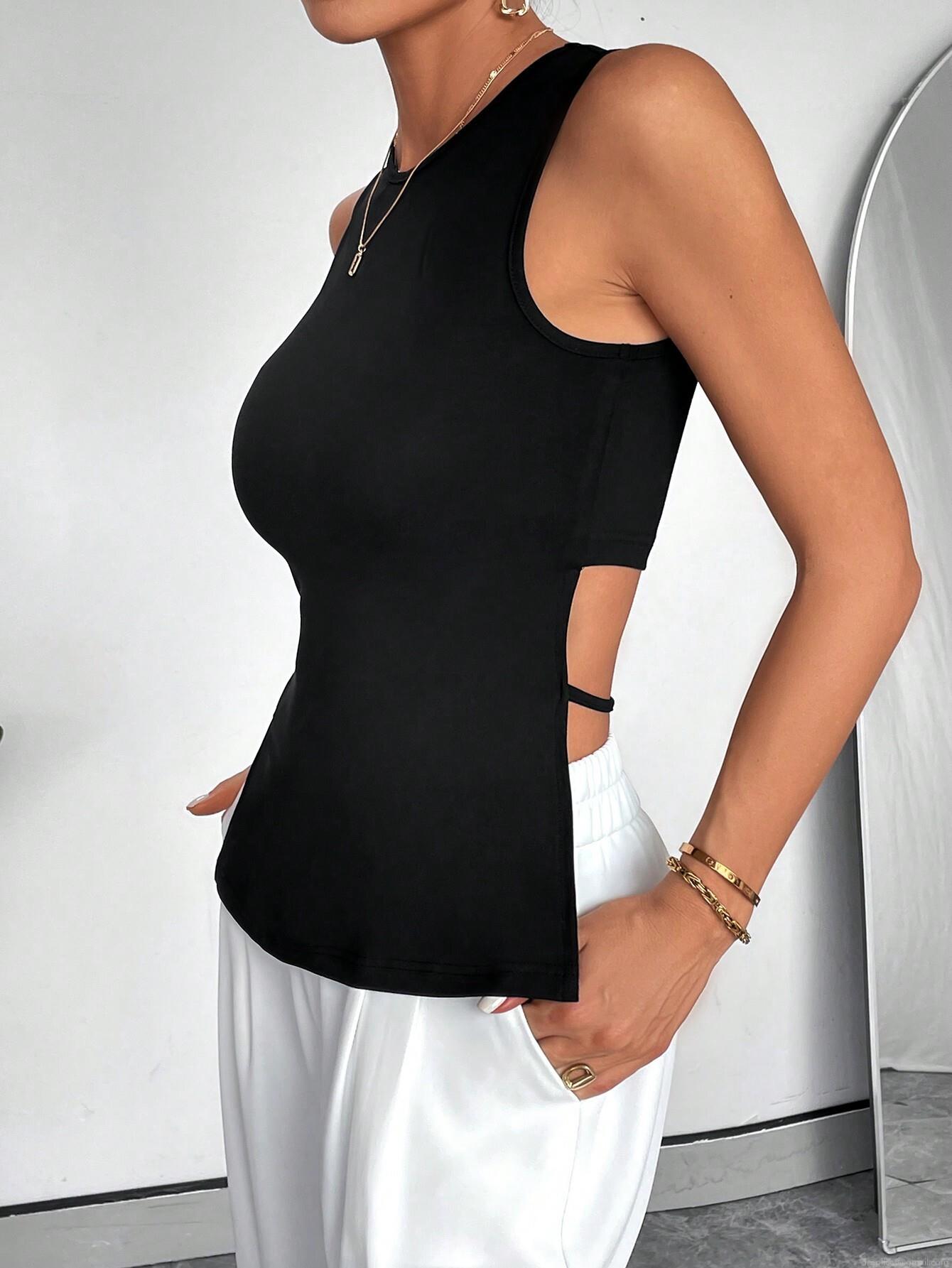 • Sexy Slim Fit Black Cut-out Tank Top Sleeveless Side Tie-up Polyester Spandex Backless Summer Vest For Women Casual Party Streetwear
