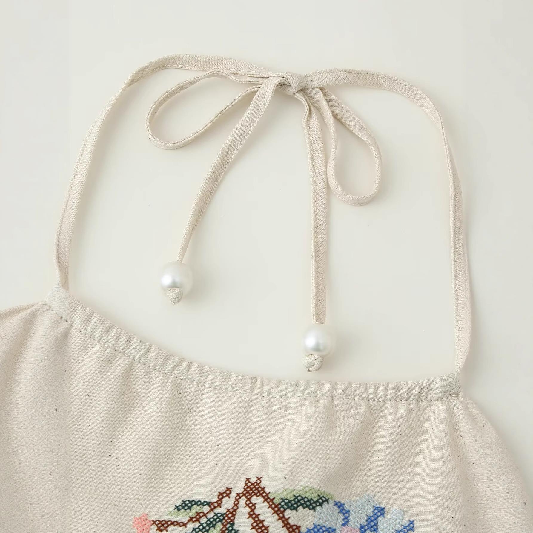 • Sexy Women Halter Neck Top Floral Embroidery Pearl Beaded Backless Tie-Up Camisole Sweet Retro Beige Sleeveless Summer Tank Top