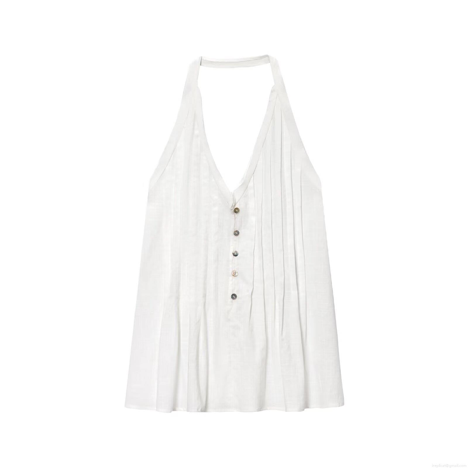 • Sexy Women Halter Top V-Neck Backless Button Up Pleated Bamboo Linen Texture Sleeveless Camisole For Summer Vacation Beach Party INS Influencer Style