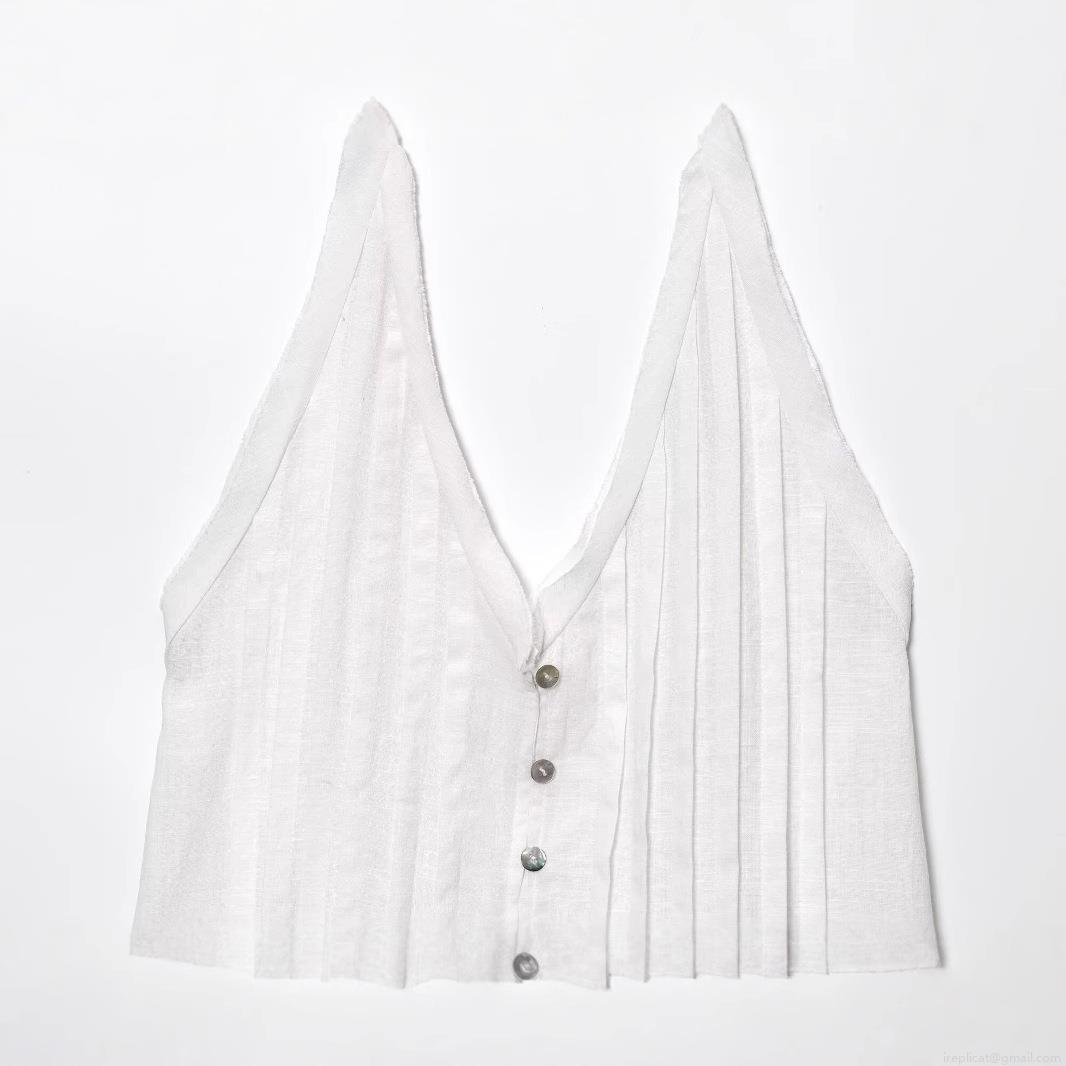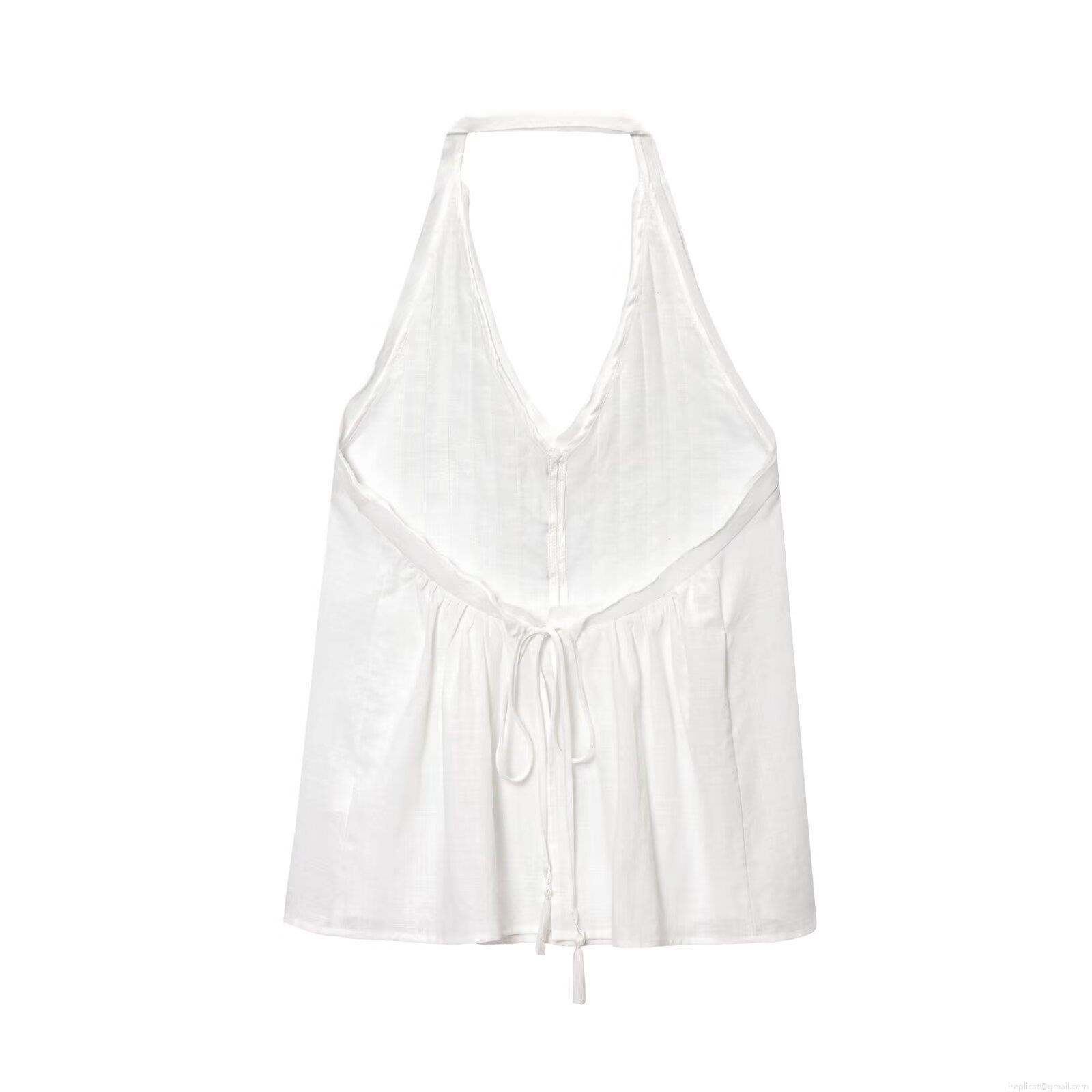Sexy Women Halter Top V-Neck Backless Button Up Pleated Bamboo Linen Texture Sleeveless Camisole For Summer Vacation Beach Party INS Influencer Style