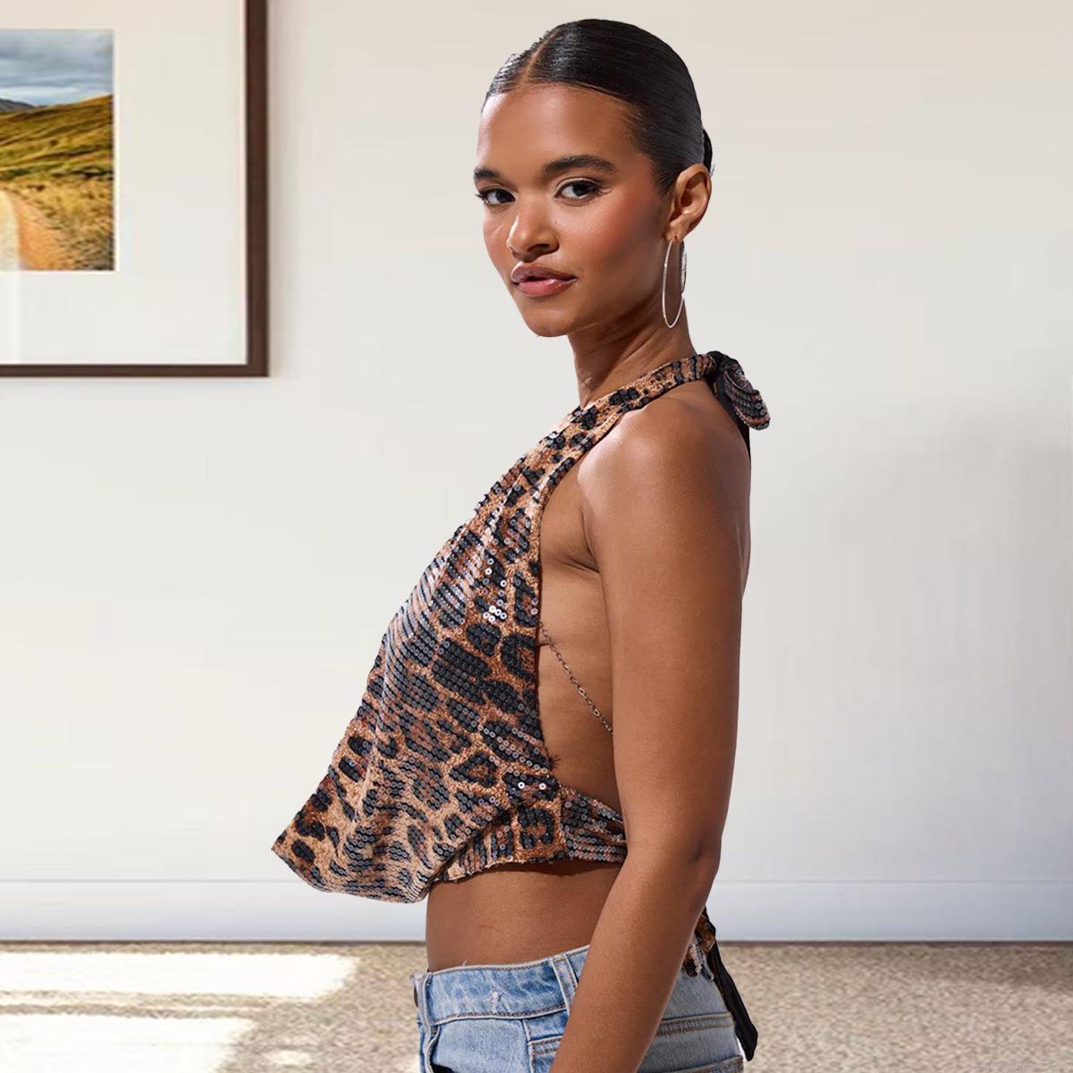 Sexy Women Leopard Sequin Halter Top Backless Tie-Up V-Neck Summer Sleeveless Party Clubwear Camisole With Metal Chain Detail