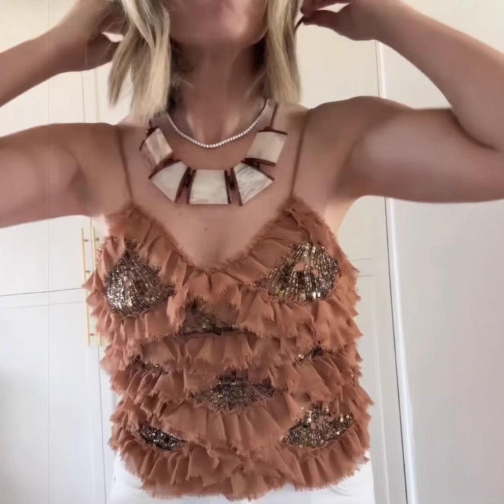 • Sexy Women Sequin Tiered Ruffle Cami Top Spaghetti Strap Backless Mesh Sleeveless Tank Top For Party Clubwear Streetwear Summer Outfits