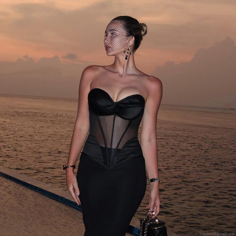 • Sexy Women Strapless Corset Top Mesh Patchwork Boning Body Shaper Slim Fit Tank Top Champagne Black Sleeveless Bustier For Party Club Night Outwear