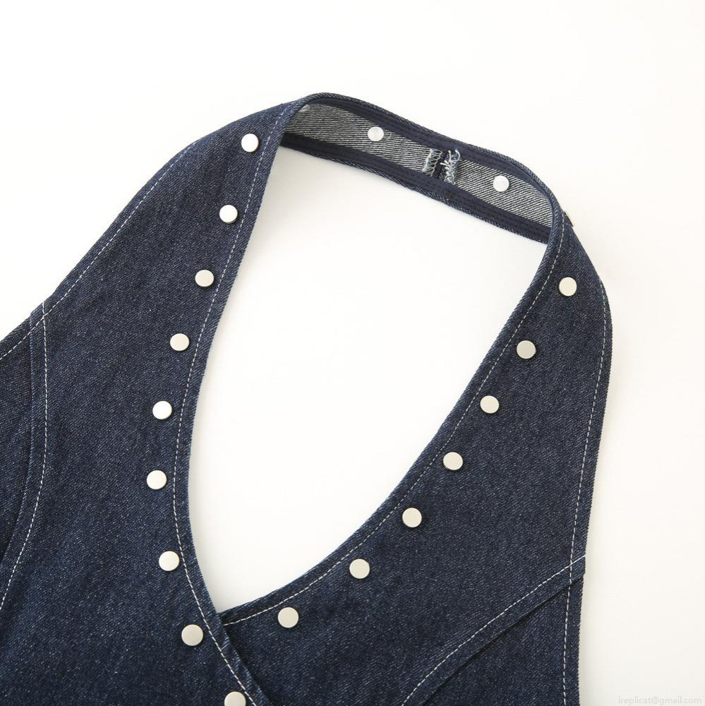 Solid Color, Neckband, Backless, Exposed Wiring, Asymmetrical Design, Rivet Decoration, Denim Texture