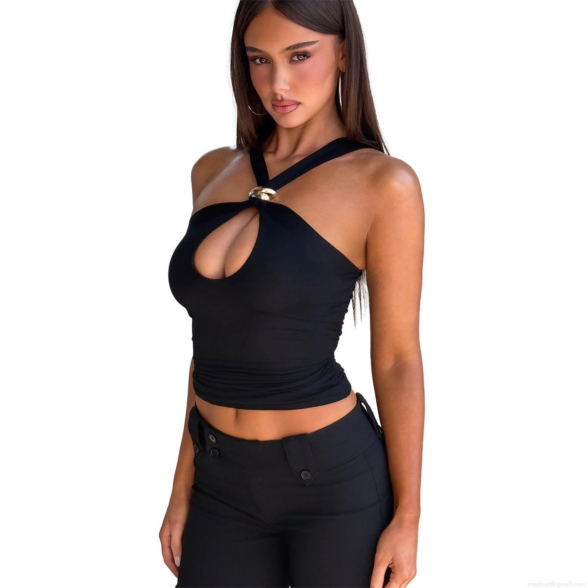 • Sexy Women's Halter Neck Crop Top With Gold Metal Ring Detail Cutout Front Cross Sleeveless Knitting Tank Top Slim Fit Solid Black Summer Party Streetwear Clubwear