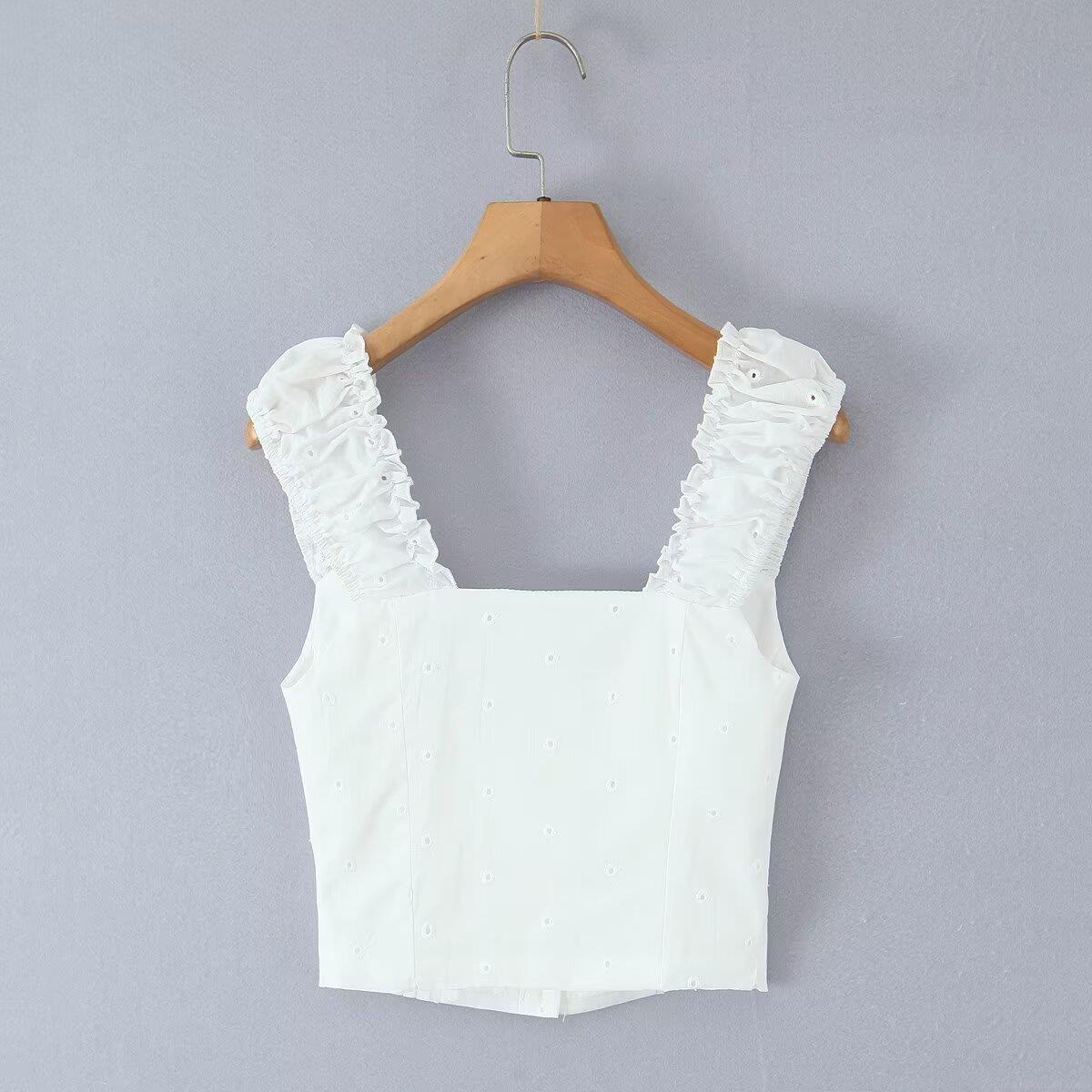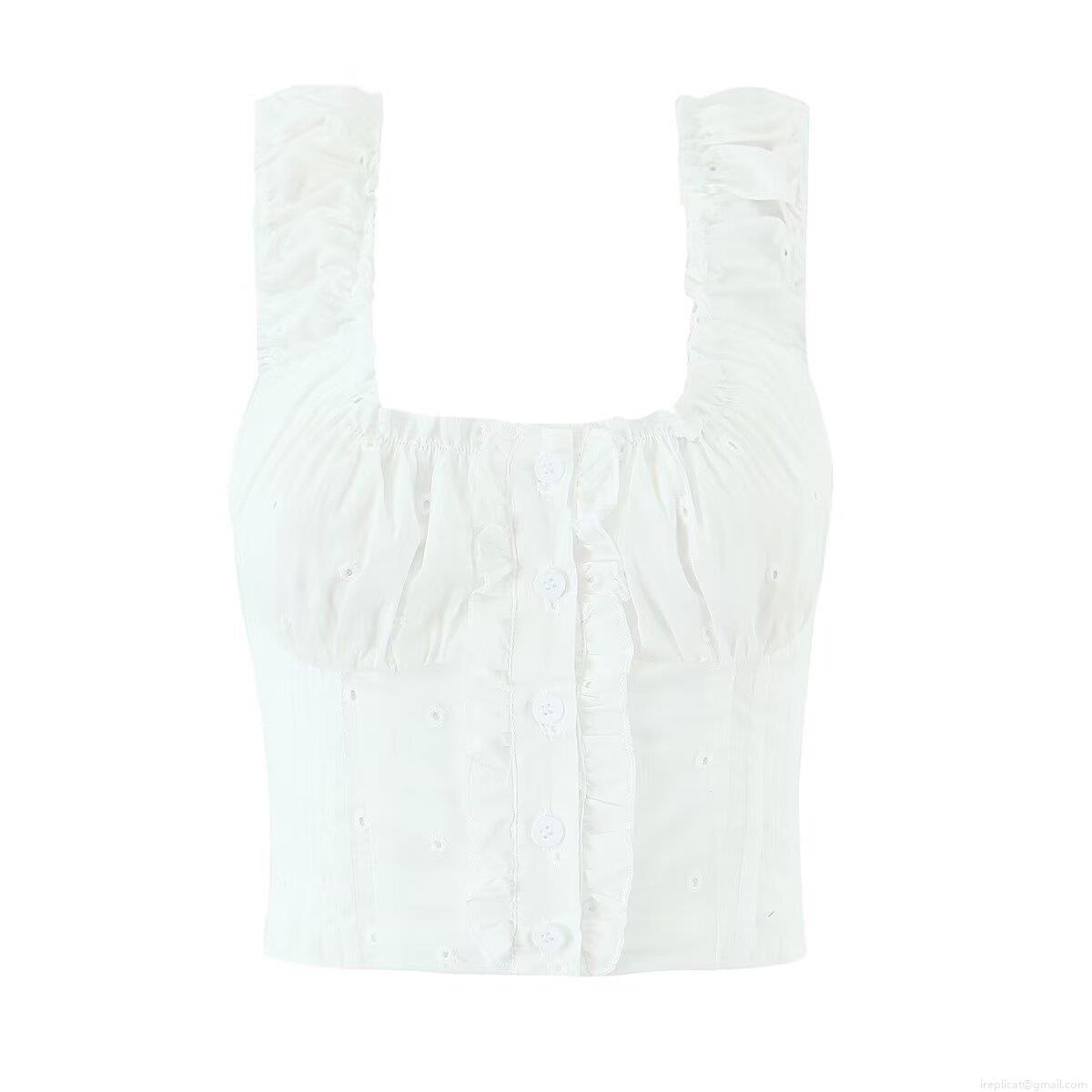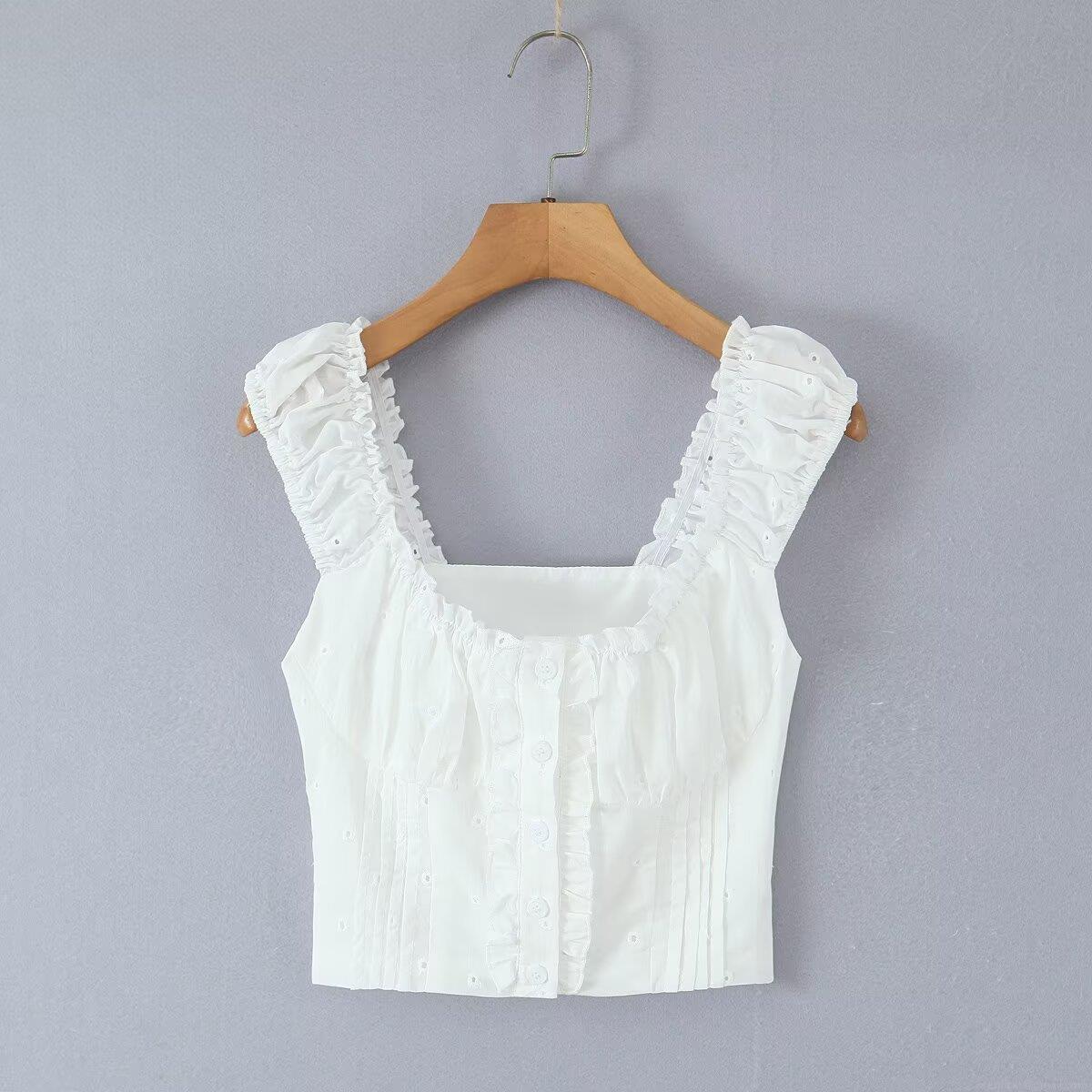 • Women 100% Cotton White Eyelet Embroidery Tank Top Ruffle Shoulder Strap Square Neck Button Up Short Cami Top Summer Casual Chic Sweet Sleeveless Blouse