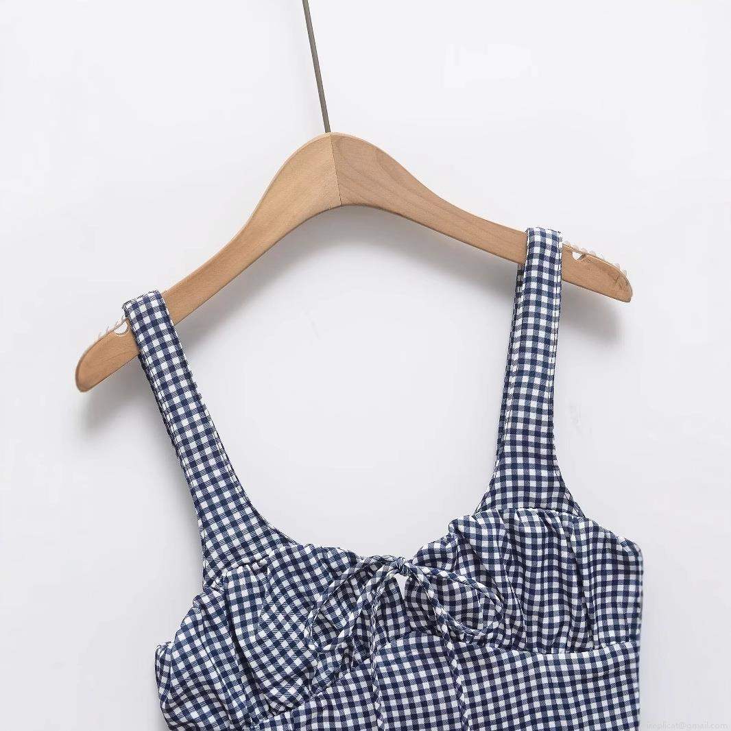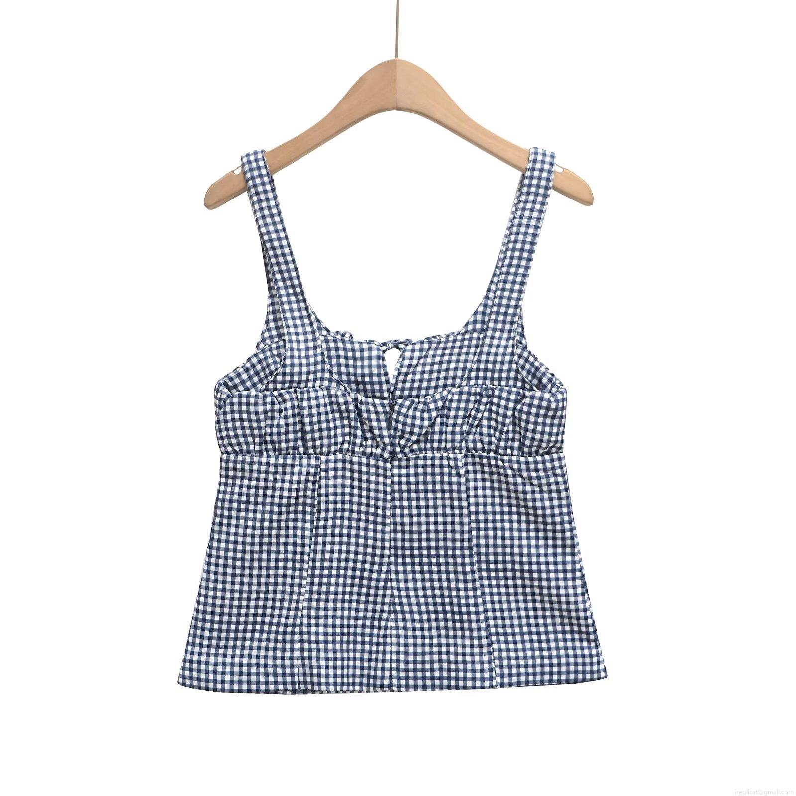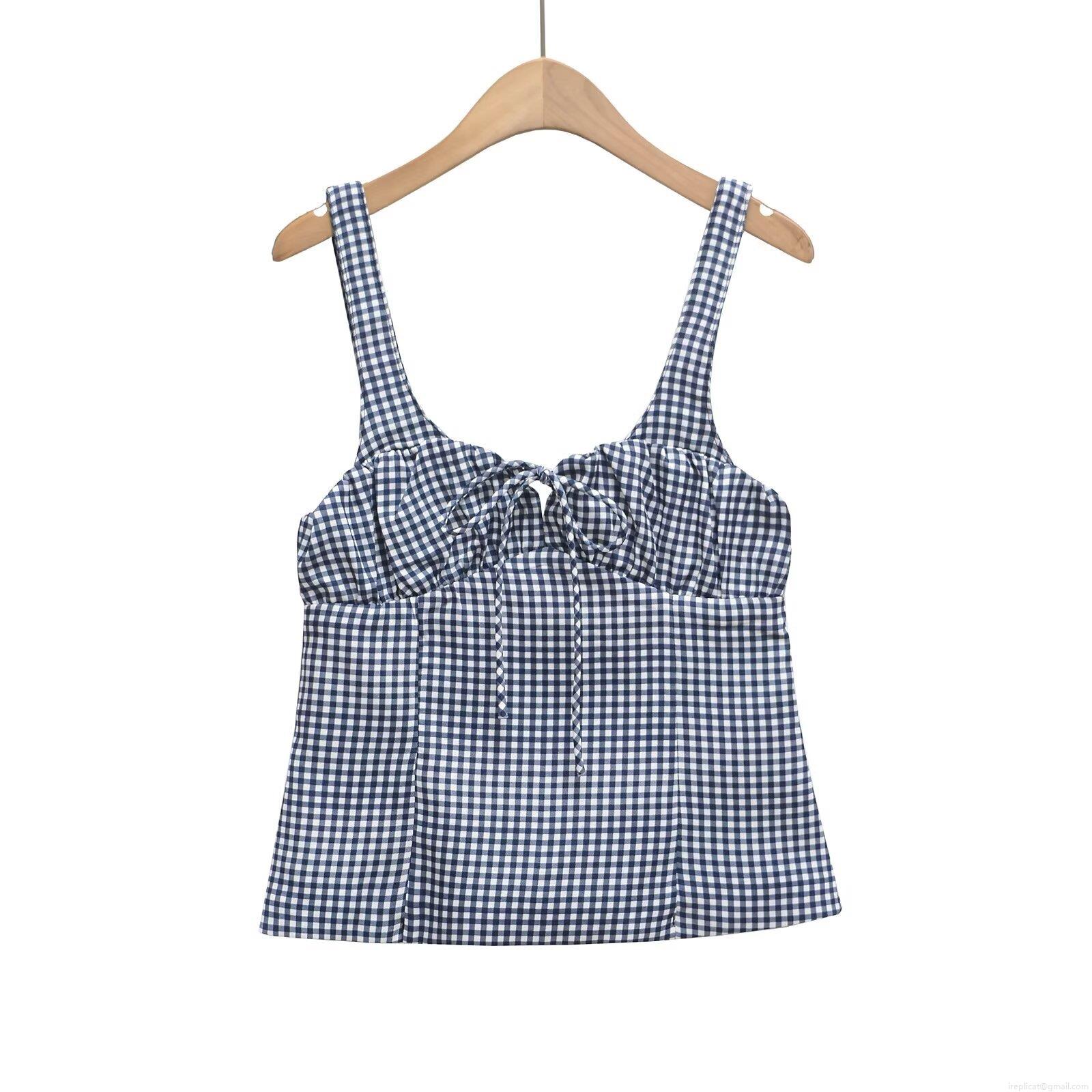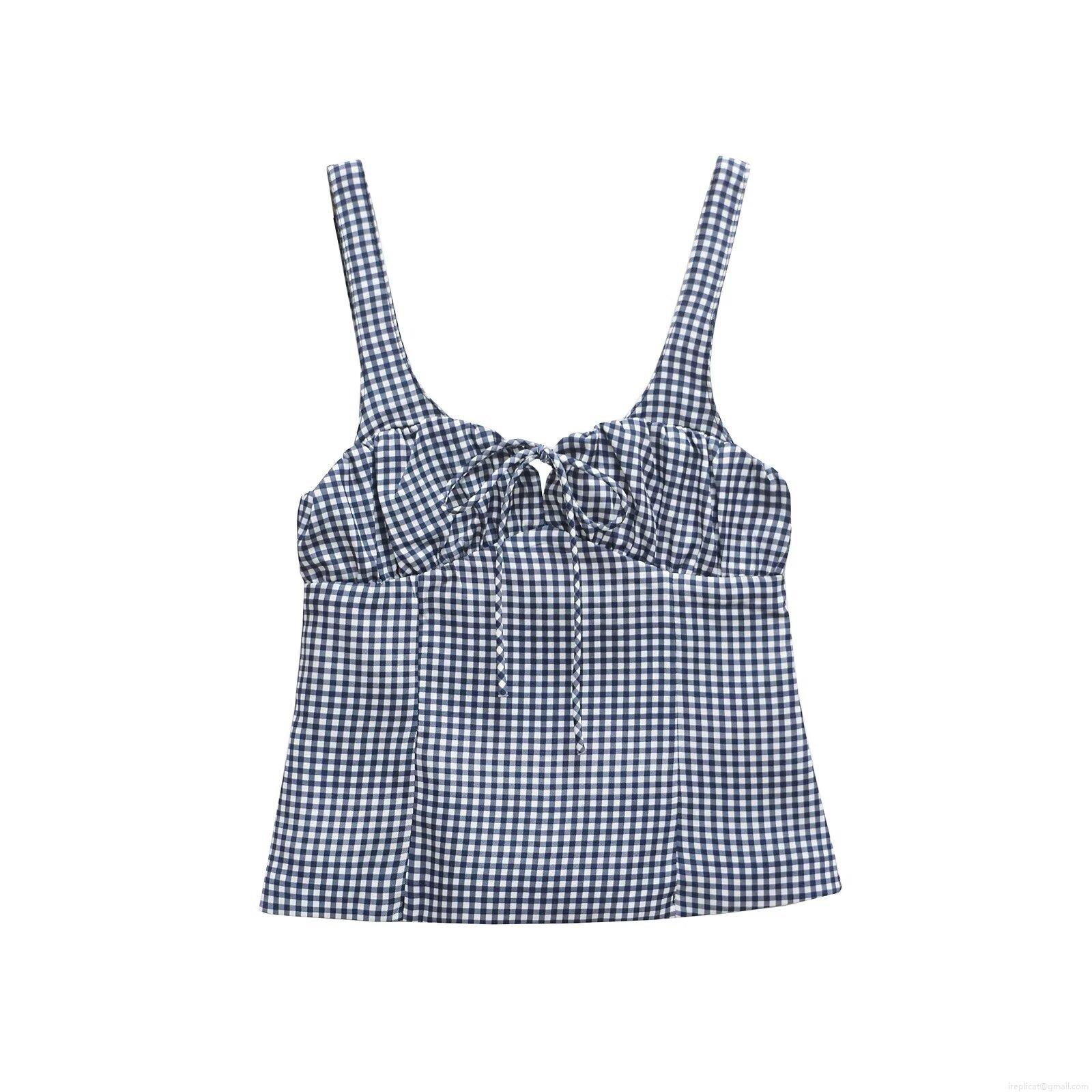 • Women Blue White Gingham Checkered Tank Top Sexy Tie Front Bow Spaghetti Strap Slim Fit Crop Top For Summer Casual Streetwear Camisole
