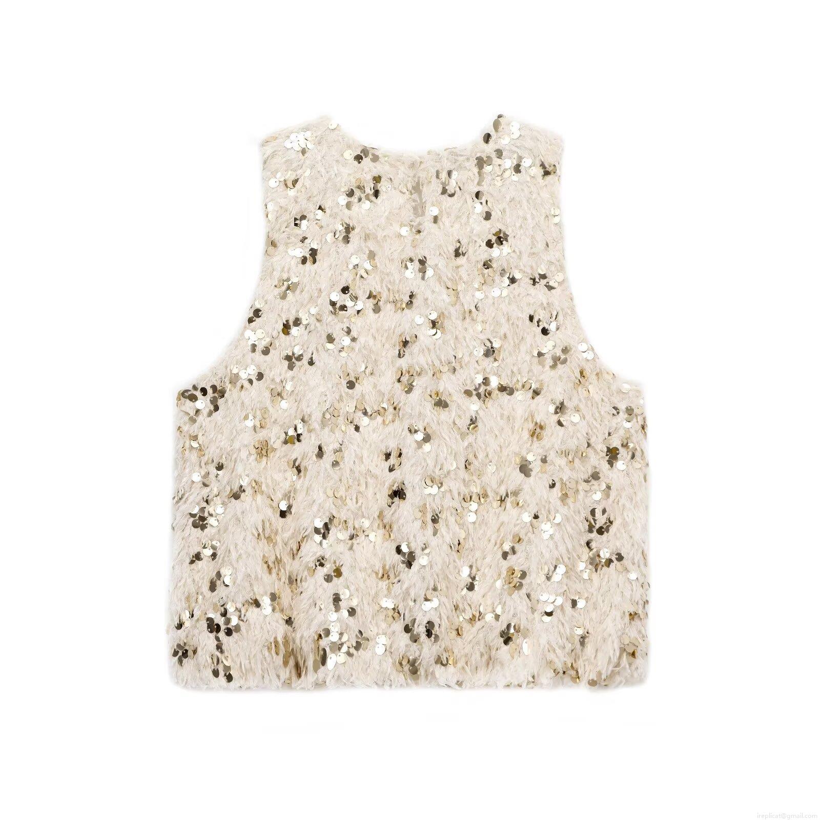 • Women Chic Sequin Faux Fur Sleeveless Vest Tank Top Round Neck Shiny Party Streetwear Waistcoat Top Gold Beige Polyester Camisole