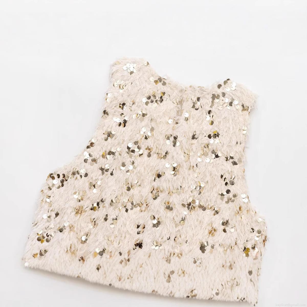 Women Chic Sequin Faux Fur Sleeveless Vest Tank Top Round Neck Shiny Party Streetwear Waistcoat Top Gold Beige Polyester Camisole