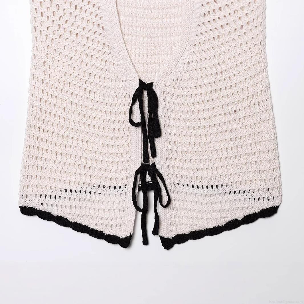 Women Crochet Knit Camisole Top Hollow Out Polyester Double Bow Tie Front Contrast Trim Sleeveless Crop Top Sweet Chic Beach Vacation Tank Top