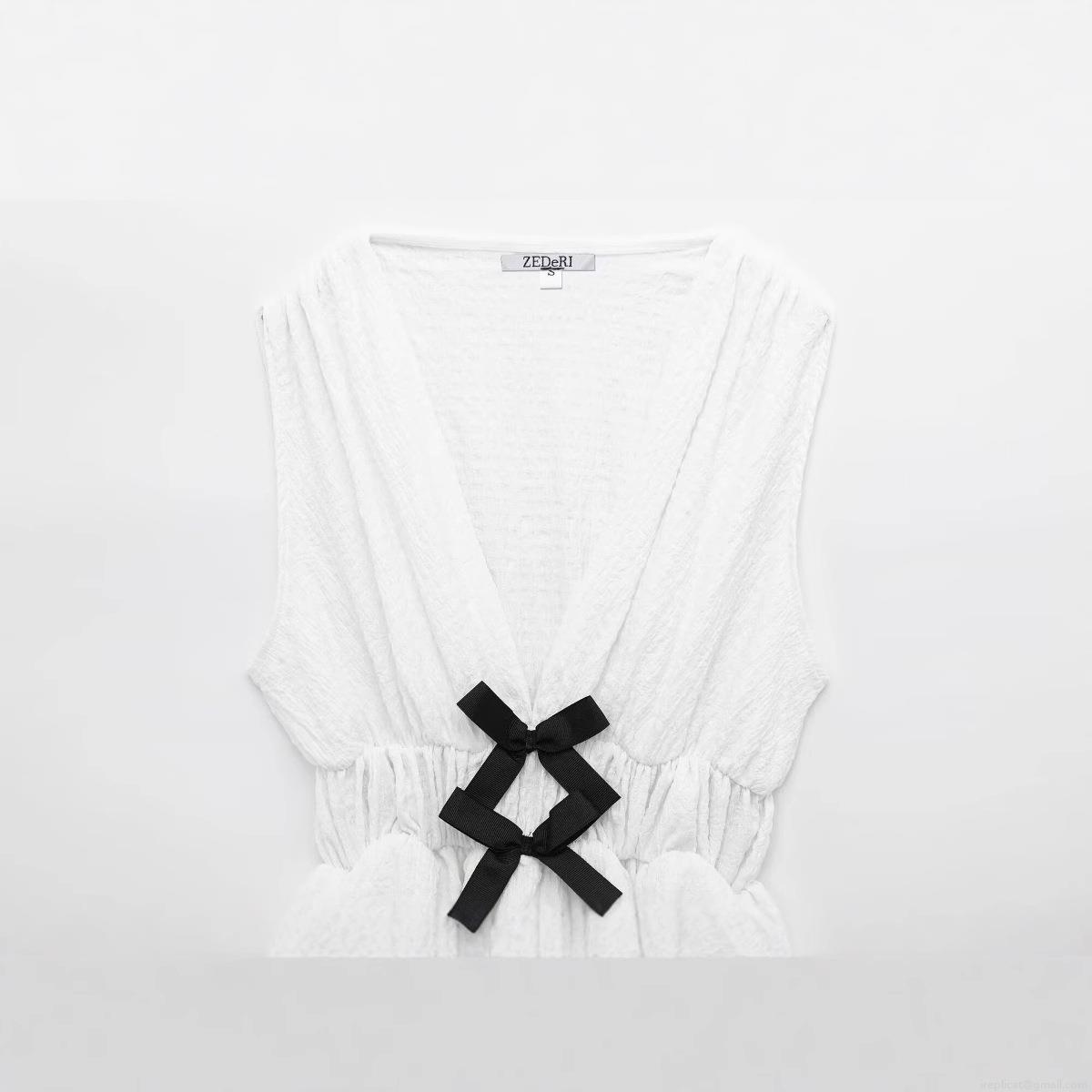 • Women Deep V Neck Sleeveless Polyester Knit Crepe Tank Top With Bow Decoration Crinkle Textured Peplum Camisole Socialite Party Elegant Blouse