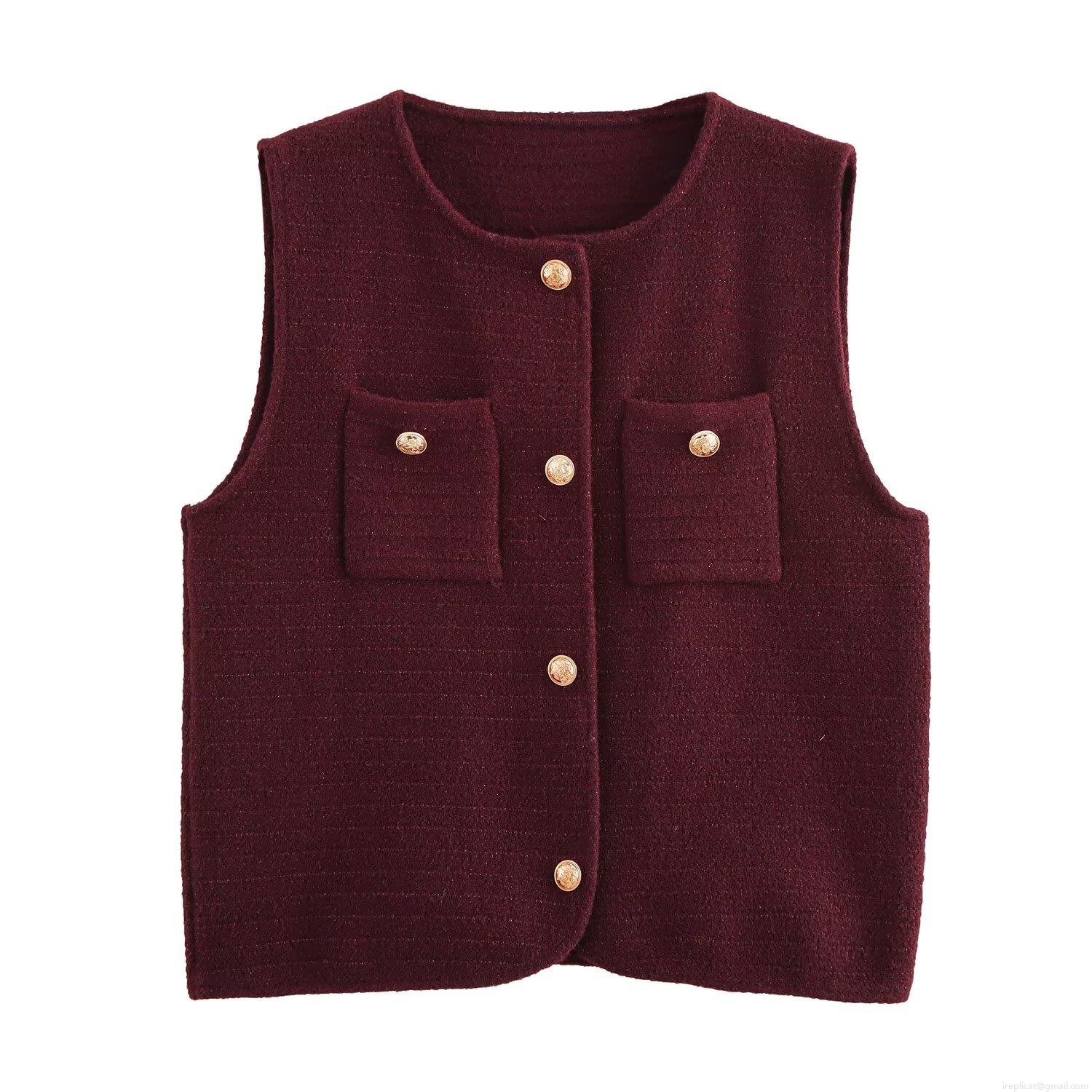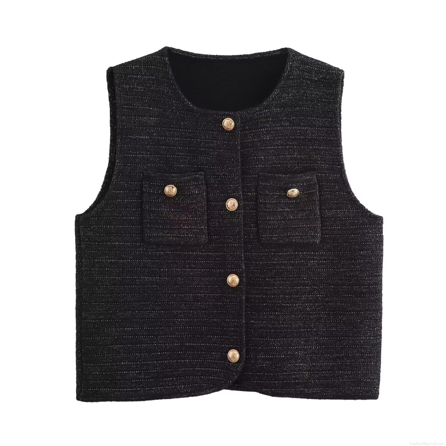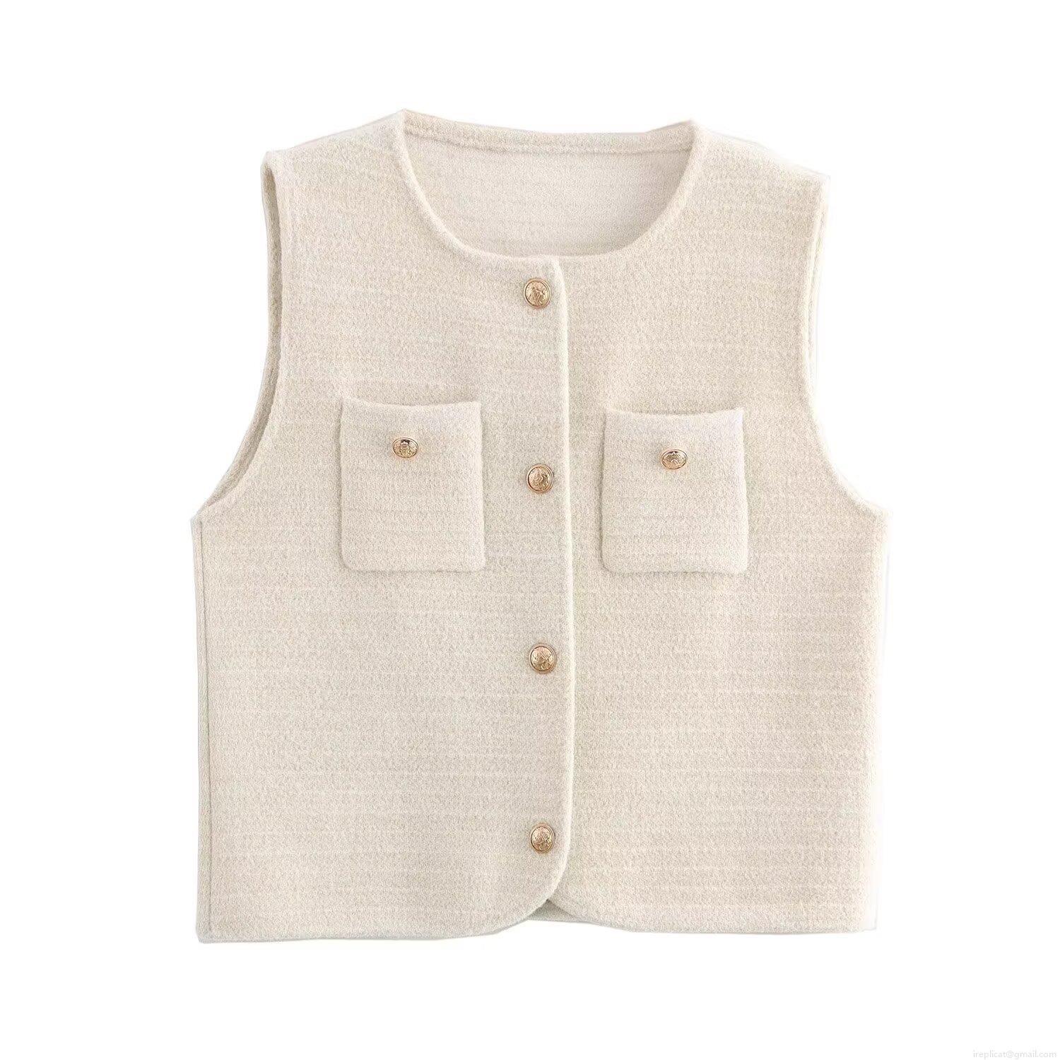 • Women Elegant Tweed Knit Vest Round Neck Gold Button Sleeveless Cardigan Vintage Streetwear Pocket Waistcoat Top For Ladies Autumn Winter