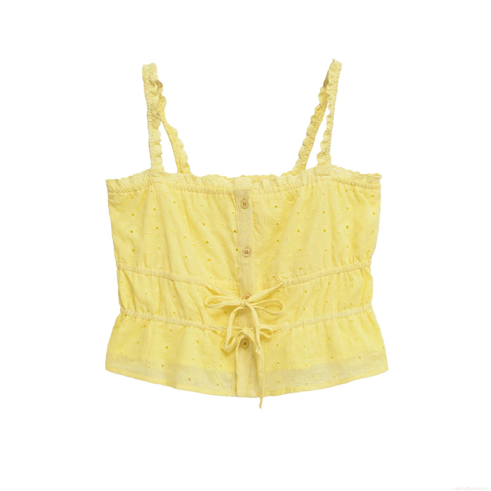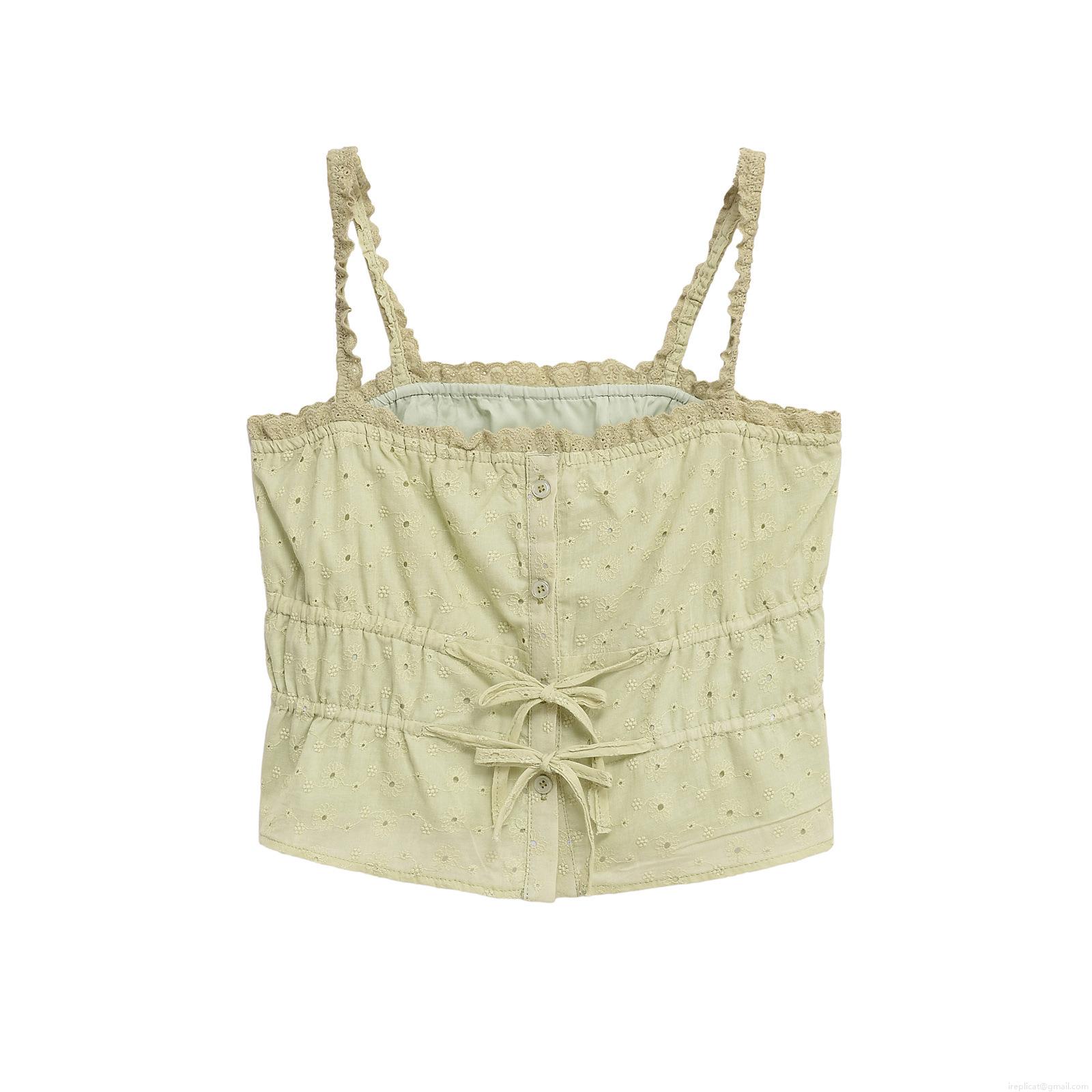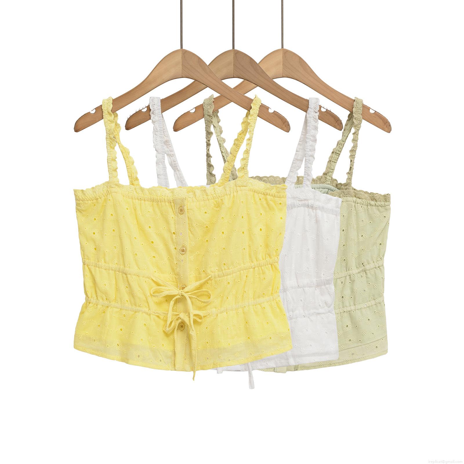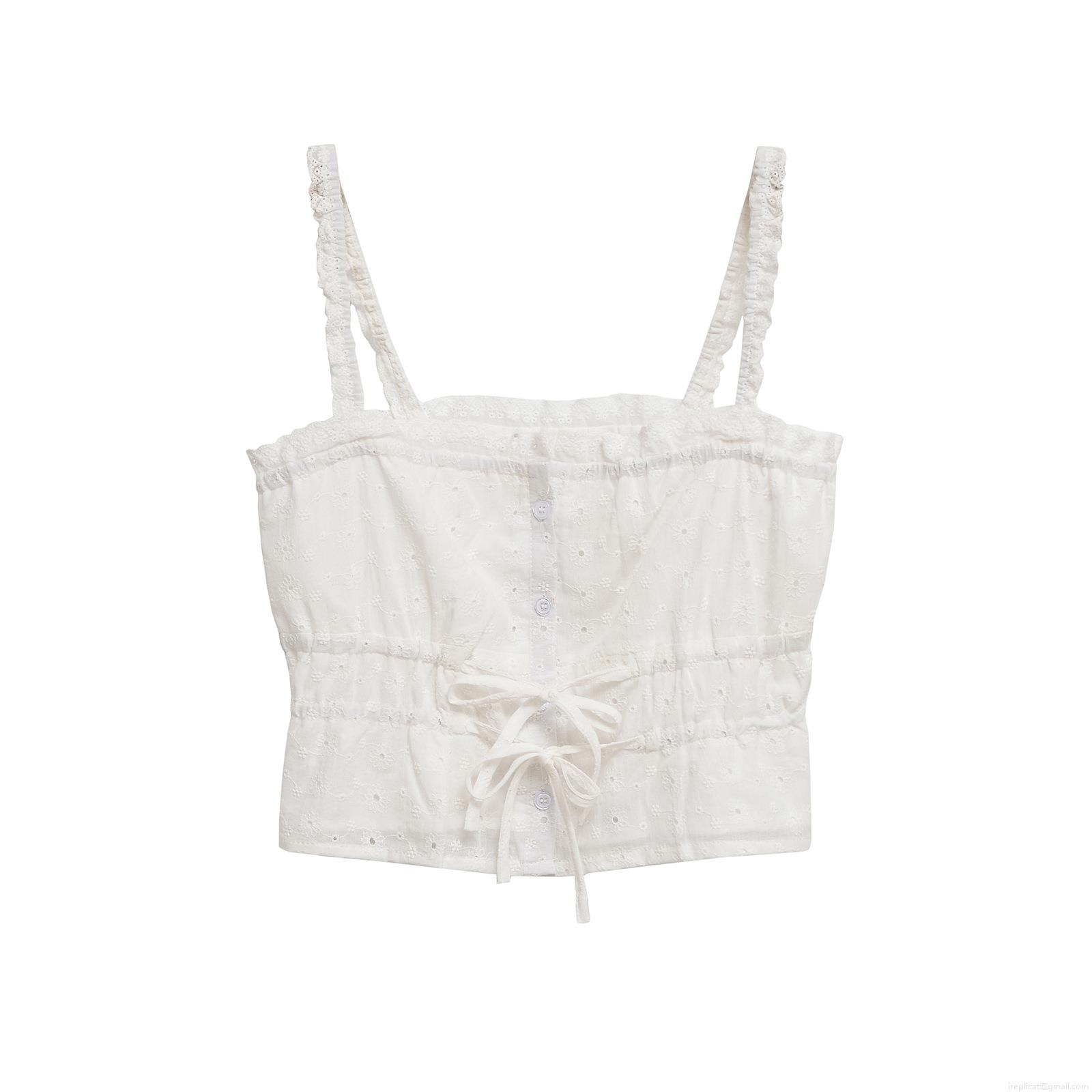 • Women Eyelet Embroidery Lace-up Camisole Ruffled Strap Slim Fit Crop Top For Summer Vacation Party Ladies Elegant Cotton Blend Eyelet Tube Top