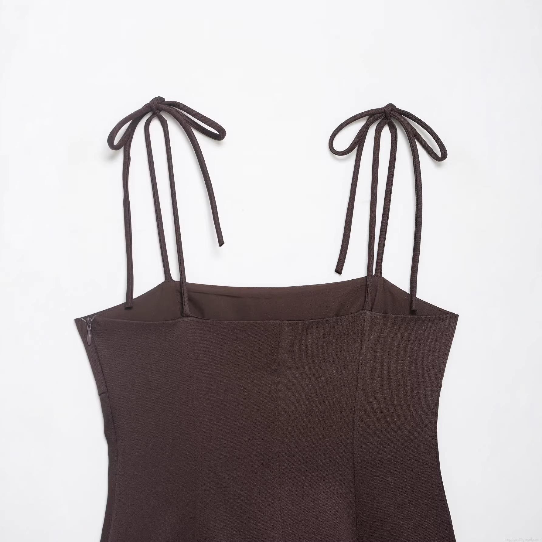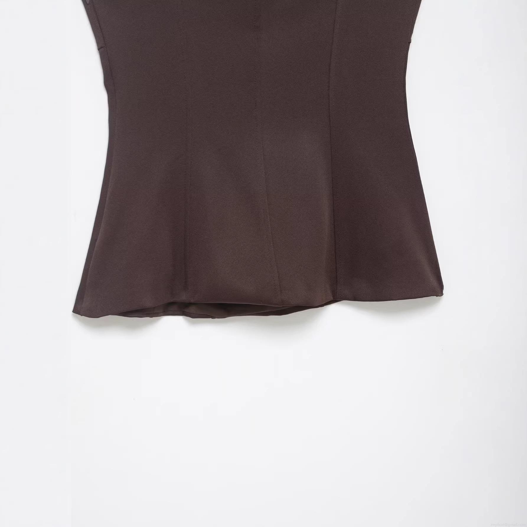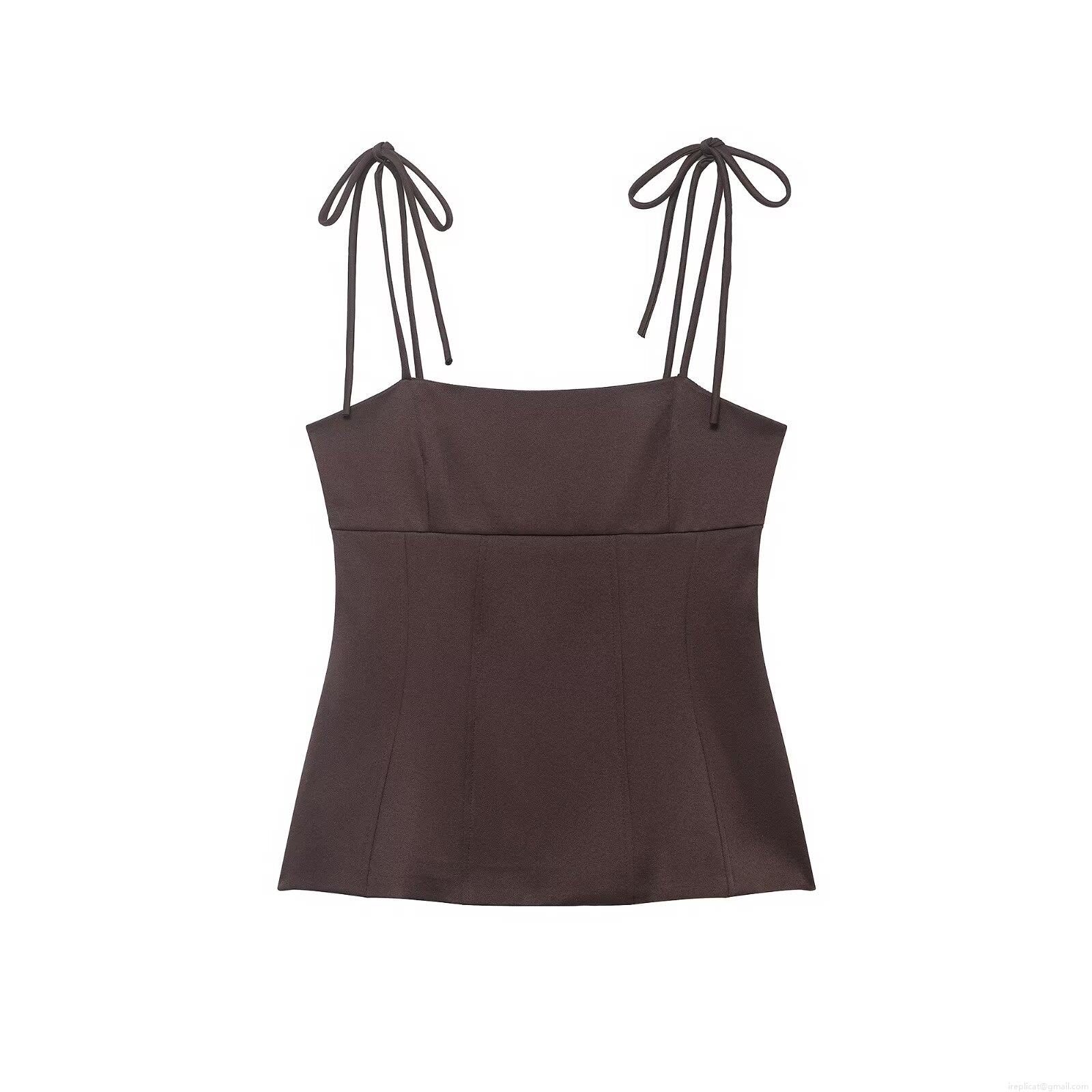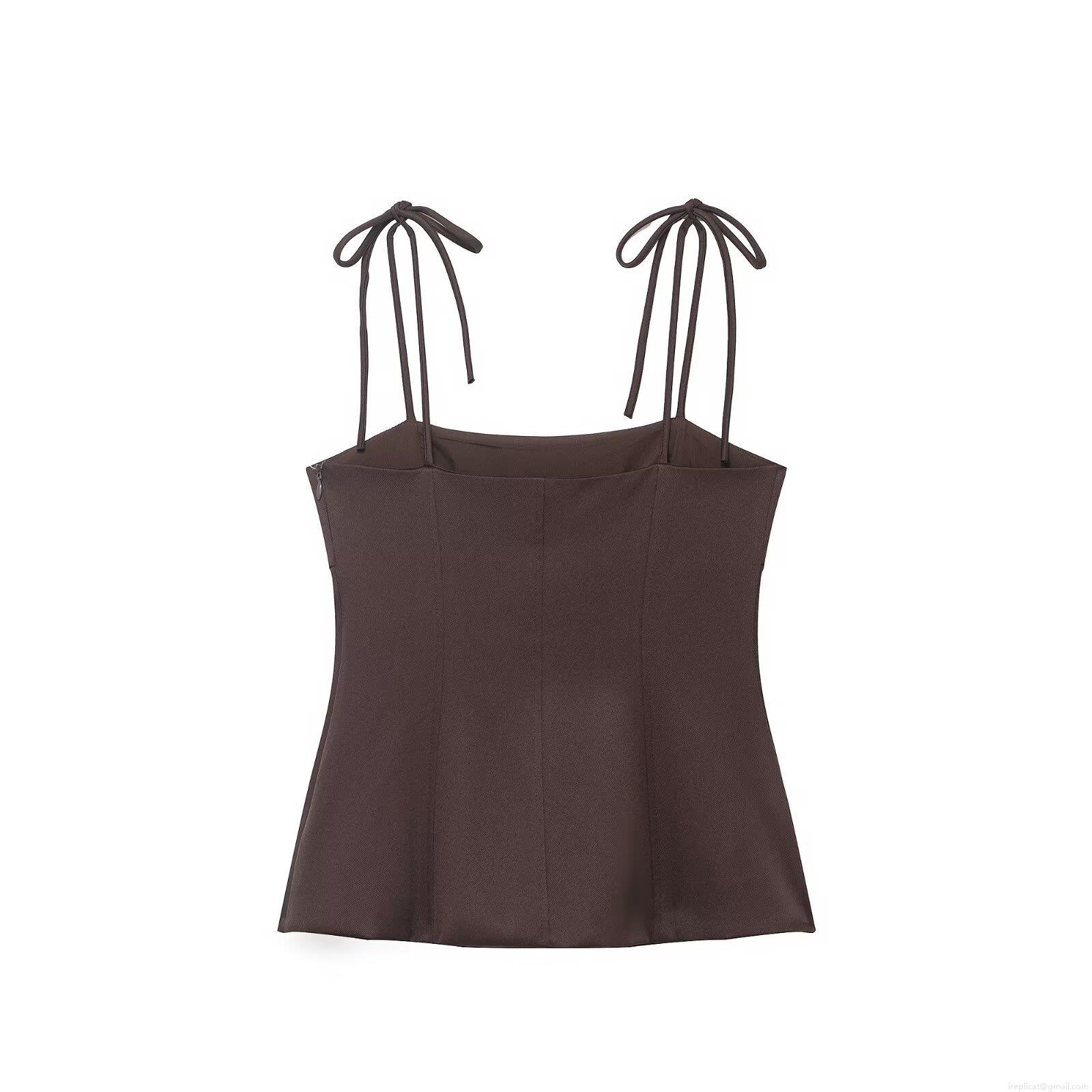 • Women Fashion Chocolate Brown Camisole Elegant Tie Shoulder Straps Slim Fit Tank Top Side Zipper Woven Solid Color Short Vest Sexy Square Neck Party Dating Summer Crop Top