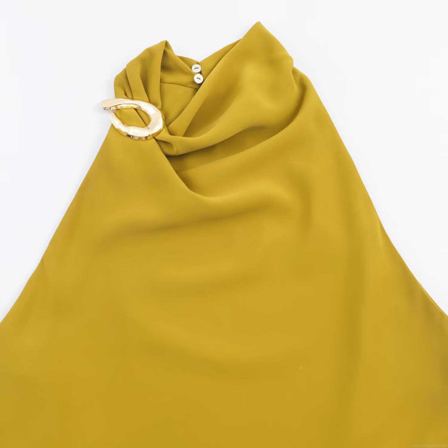 Women Fashion Halter Neck Satin Tank Top With Metal Buckle Casual Loose Sleeveless Summer Blouse For Party Vacation Lady