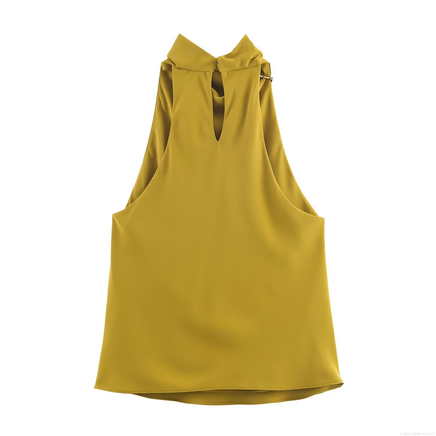 • Women Fashion Halter Neck Satin Tank Top With Metal Buckle Casual Loose Sleeveless Summer Blouse For Party Vacation Lady
