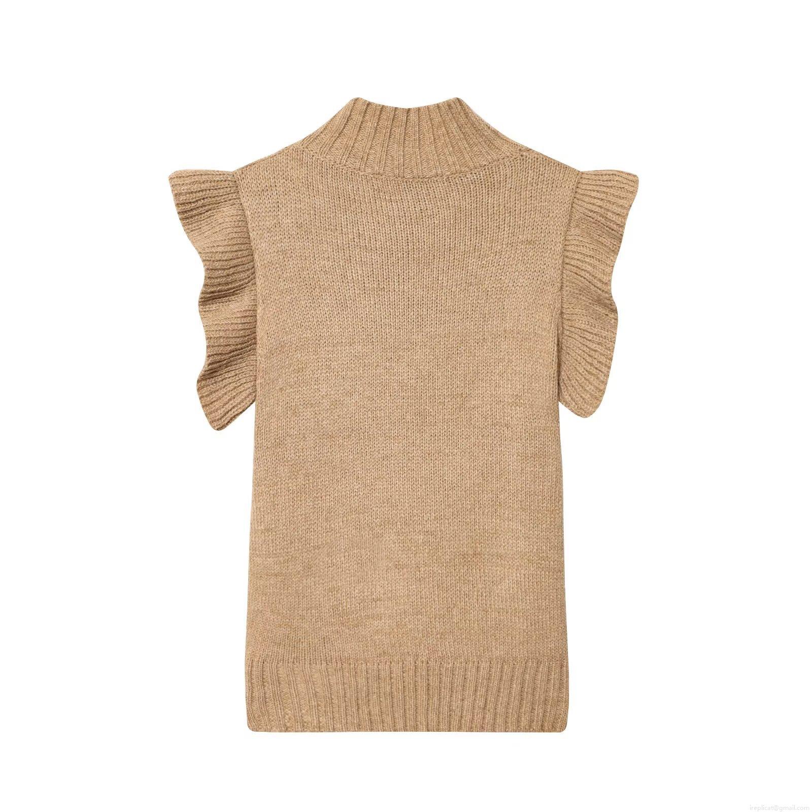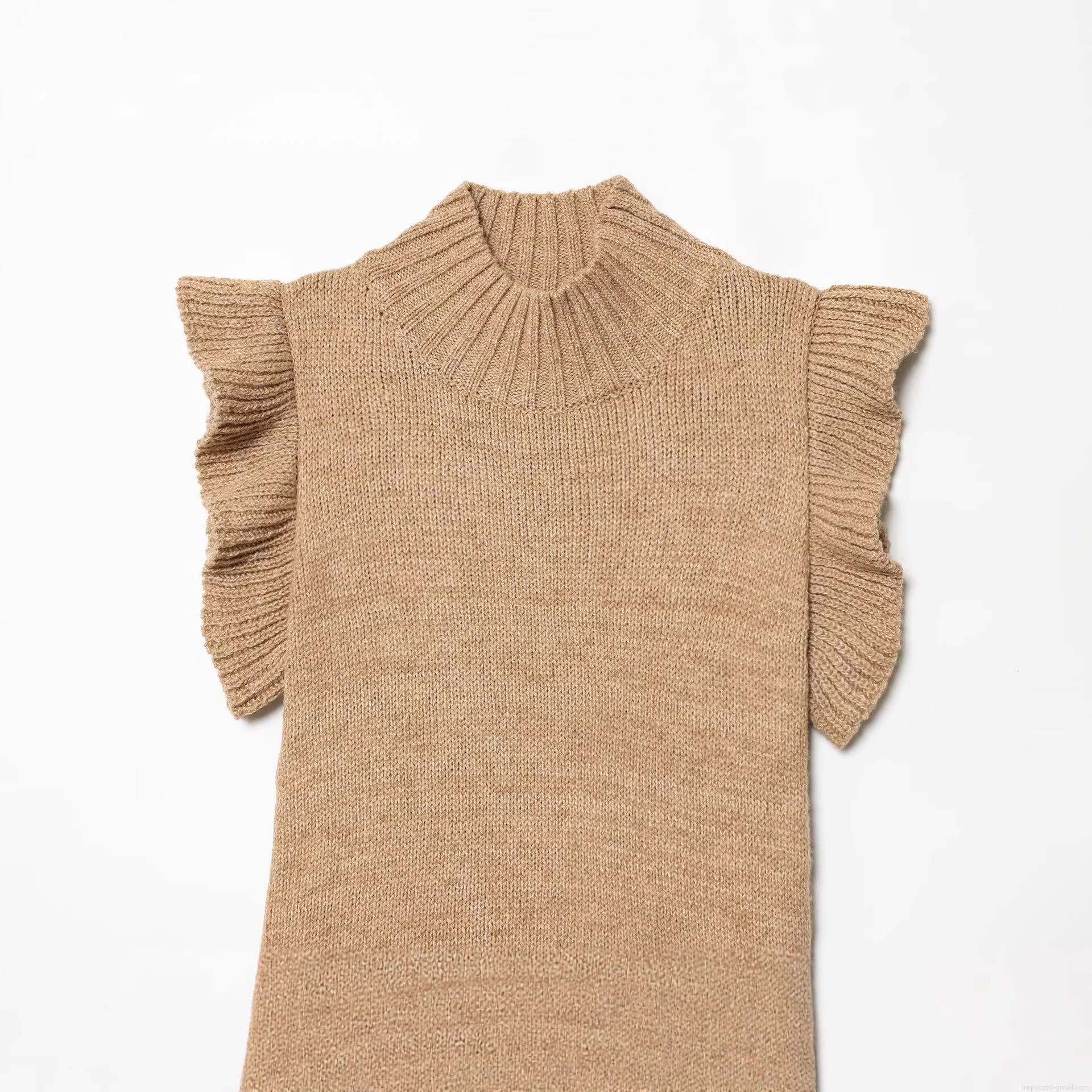 Women Fashion Slim Fit Knit Vest Mock Neck Ruffle Sleeve Tank Top Sleeveless Polyester Knitwear Camel Casual Top For Women