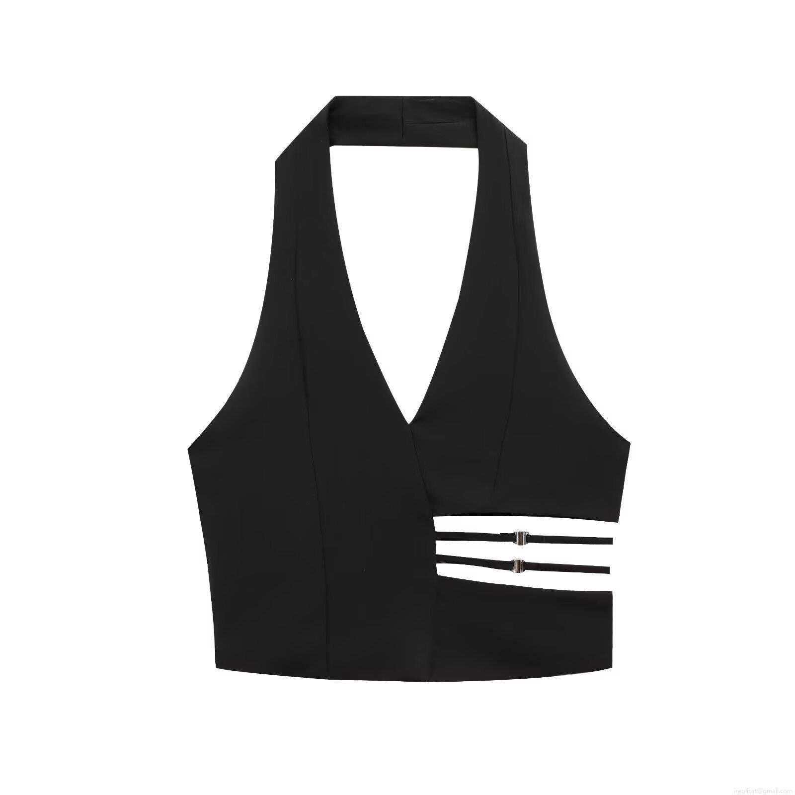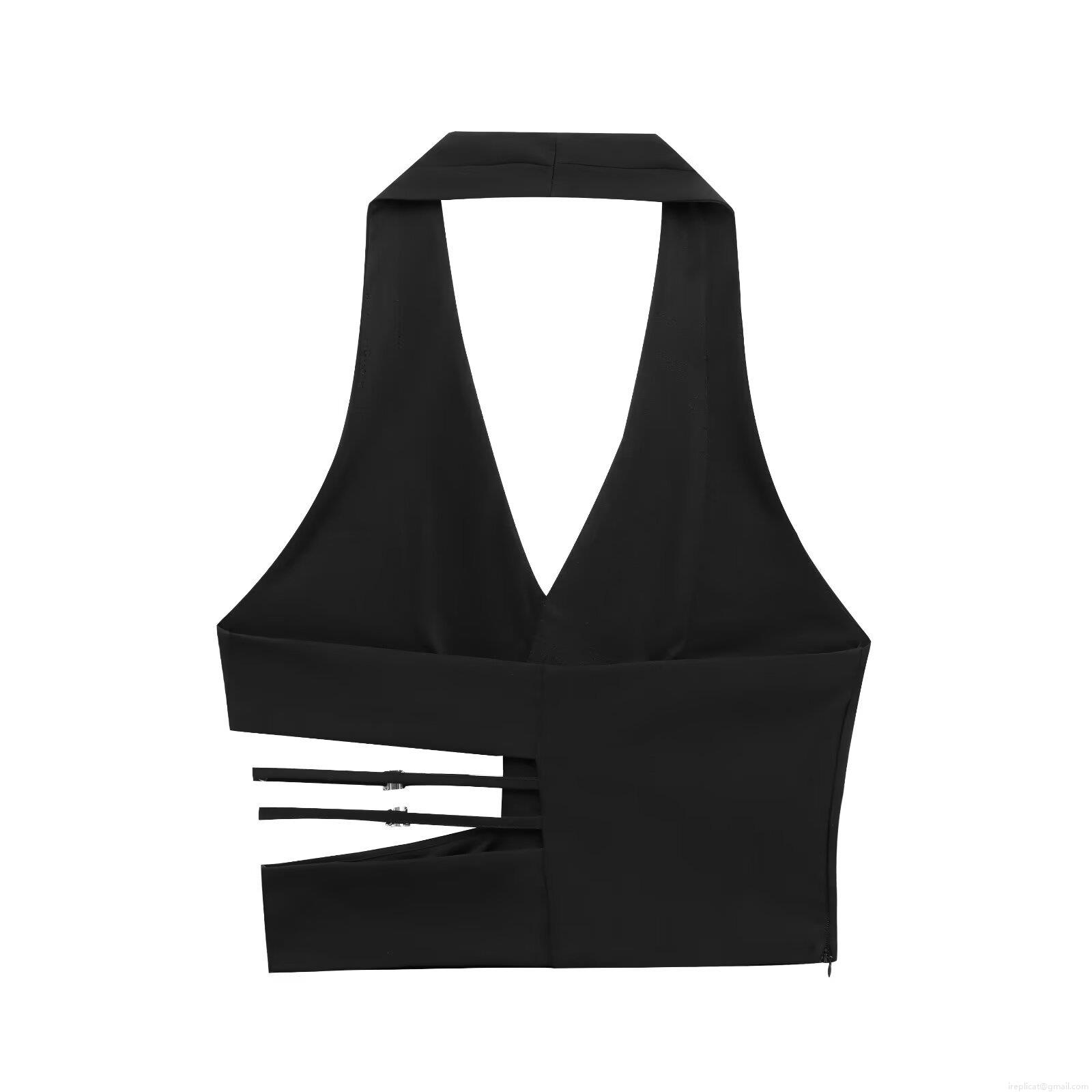 • Women Halter Neck Crop Top Sexy V-Neck Side Cutout With Metal Buckles Sleeveless Slim Fit Polyester Tank Top For Party Clubwear Summer Fashion Streetwear