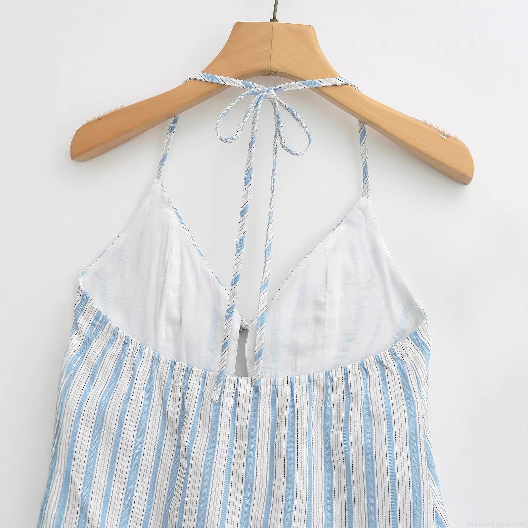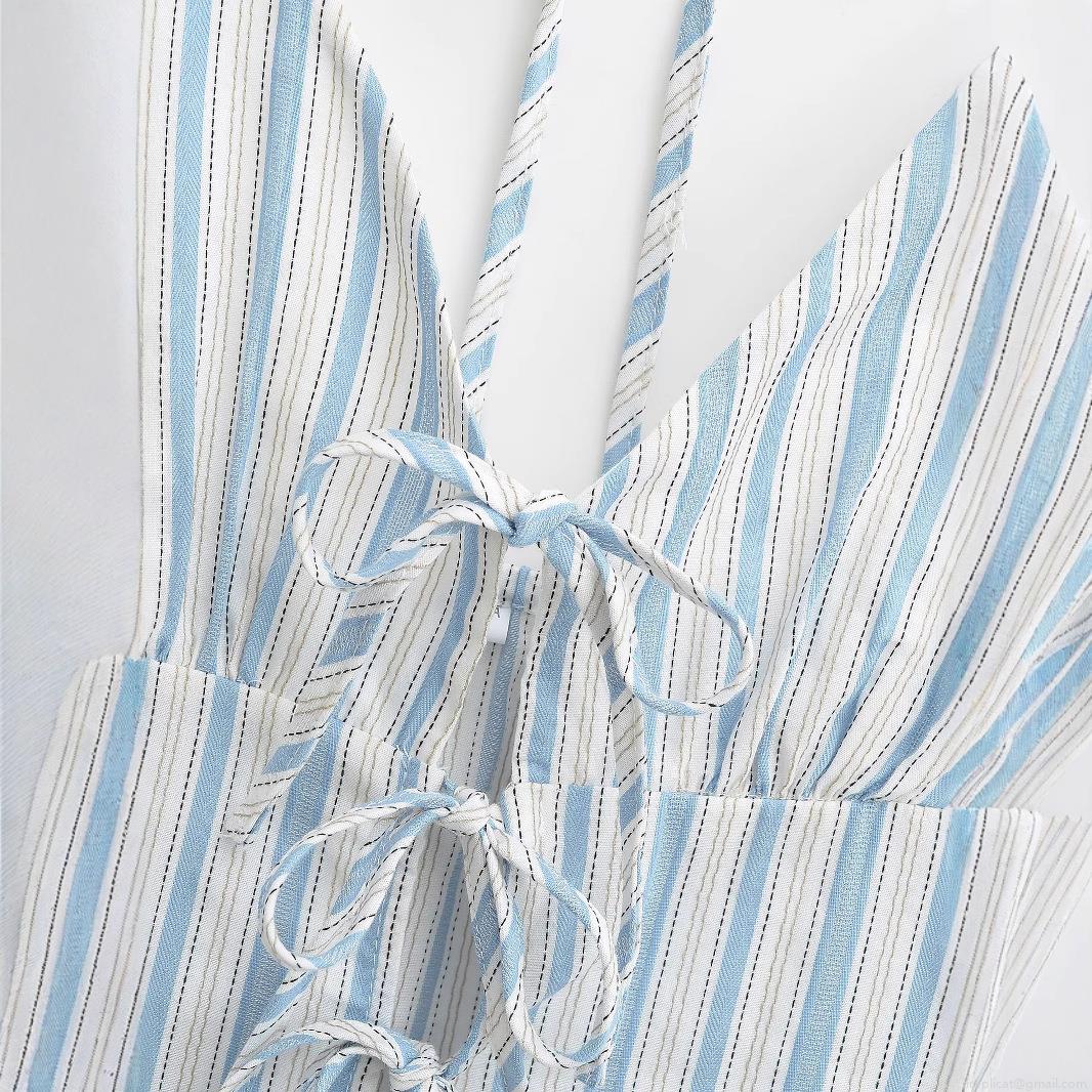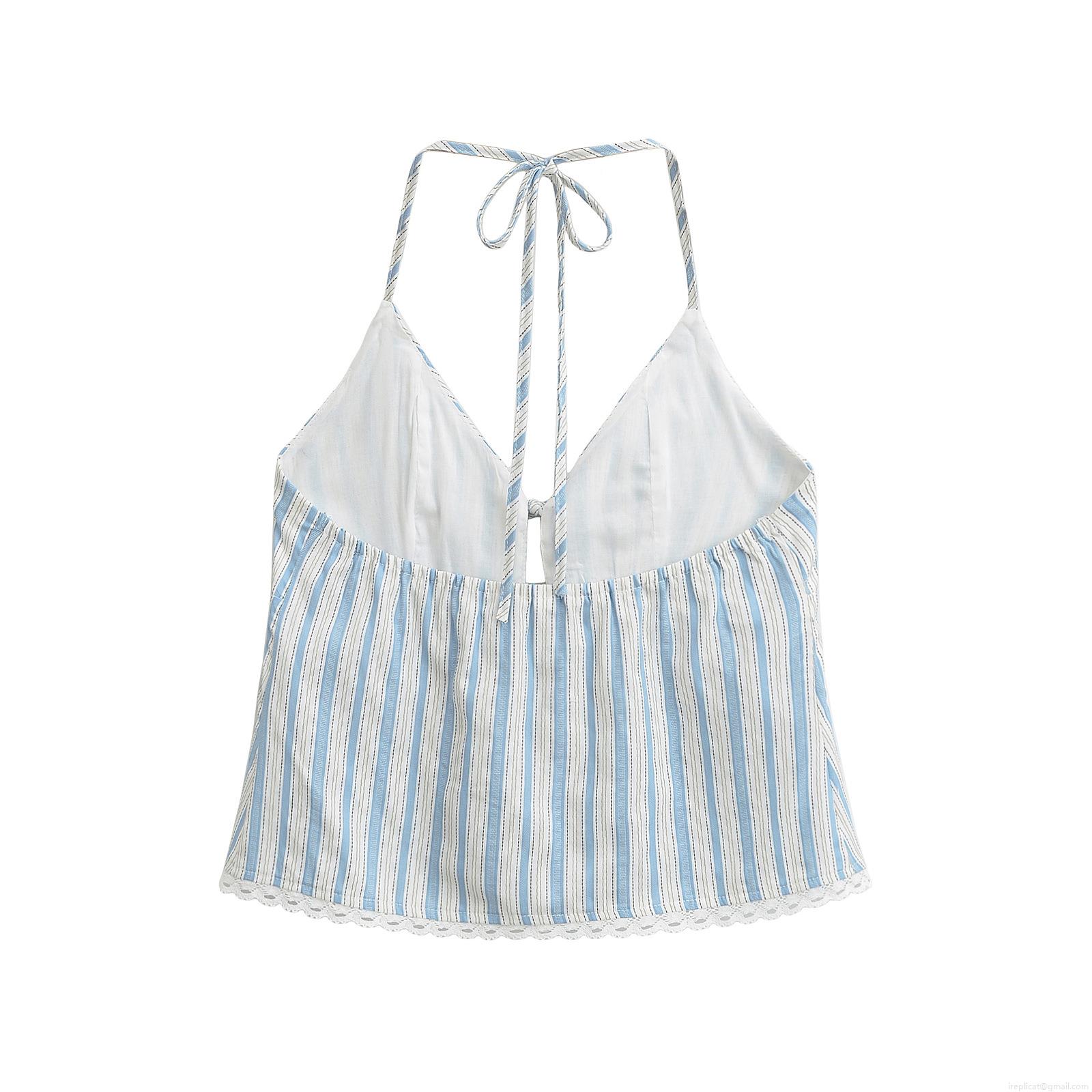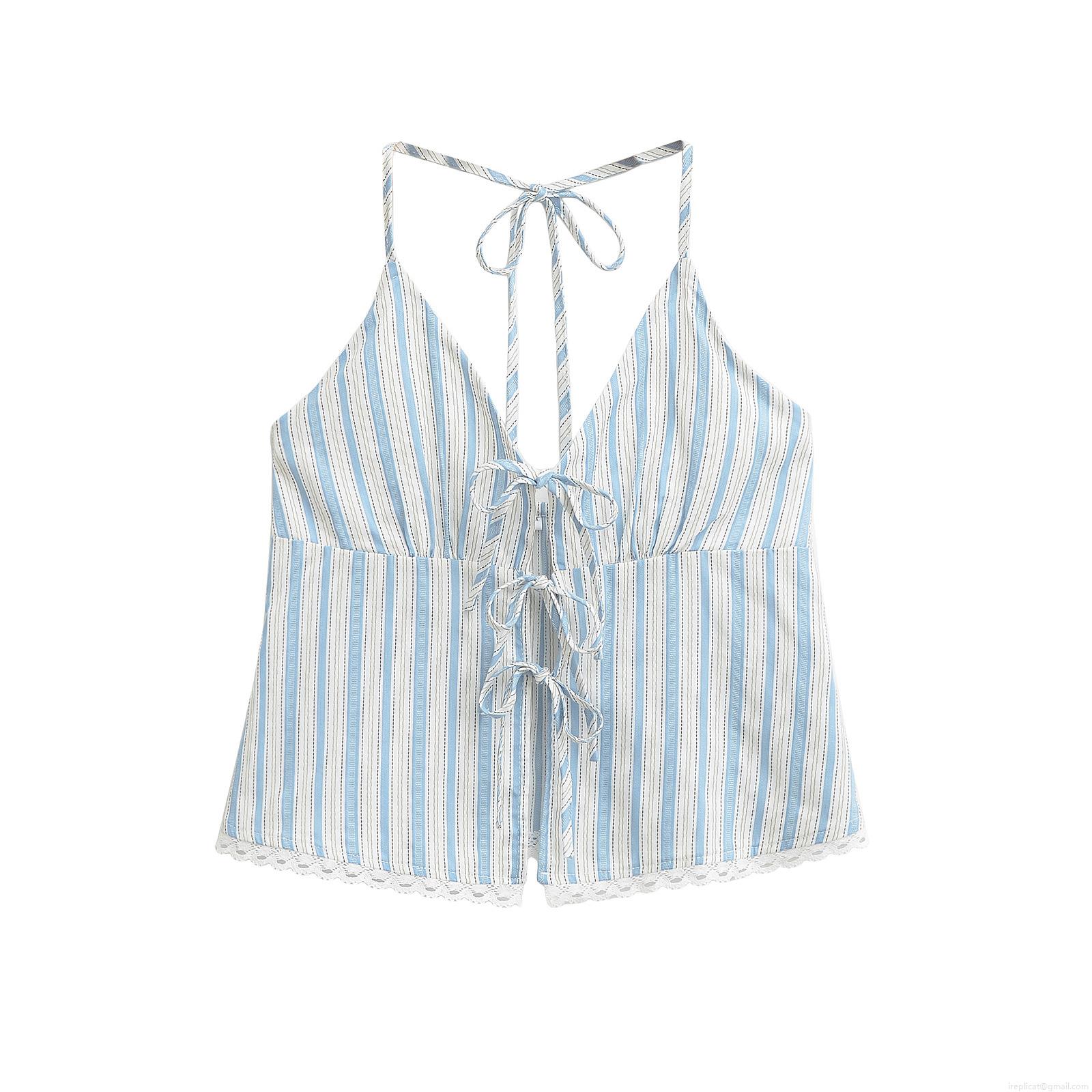 • Women Halter Neck Tank Top Blue White Striped Backless Bow Tie Cropped Camisole Top With Lace Trim For Summer Streetwear Daily Wear