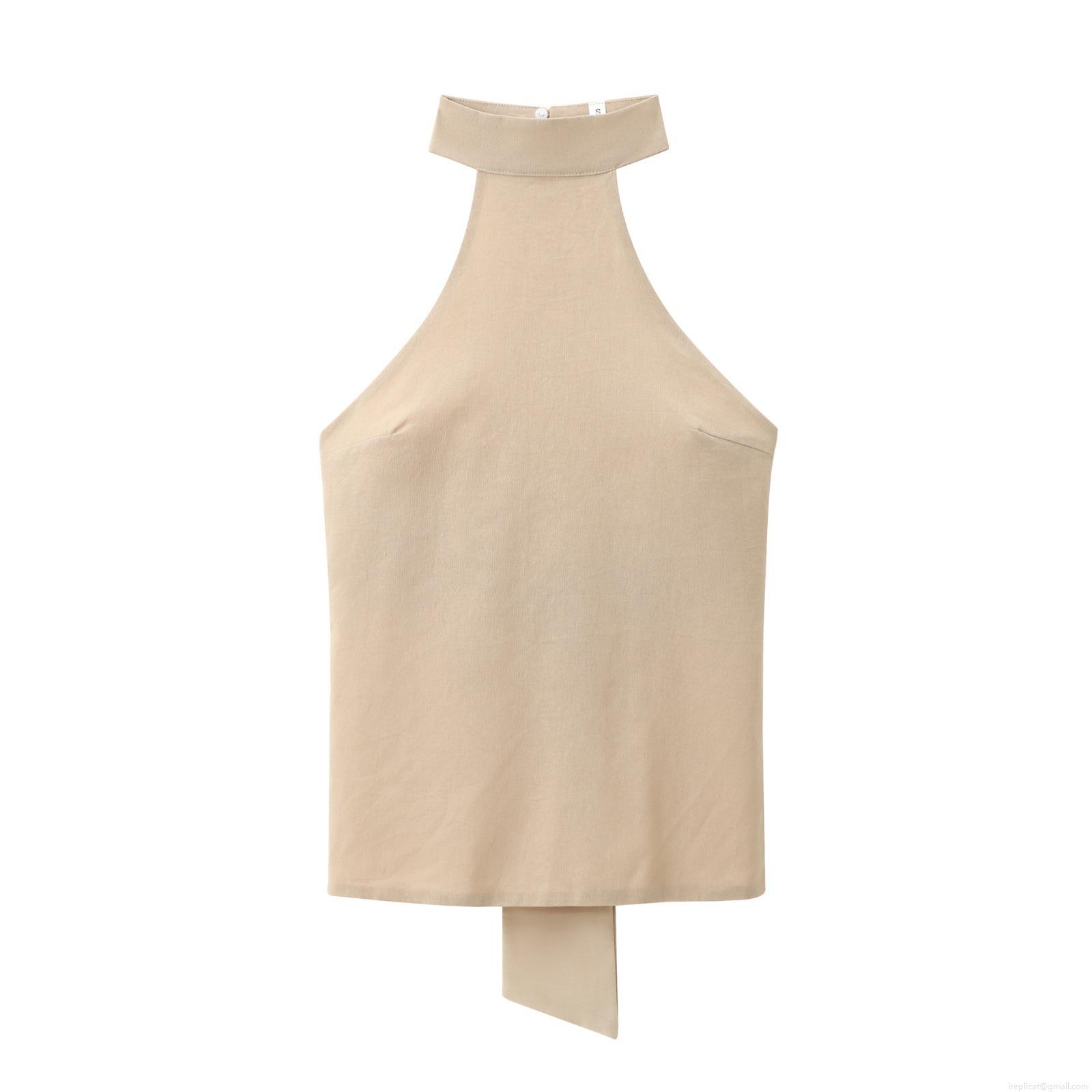 Women Halter Neck Tank Top Polyester Linen Blend Backless Sleeveless Top With Metal Buckle Summer Elegant Socialite Crop Top For Party Dating Women